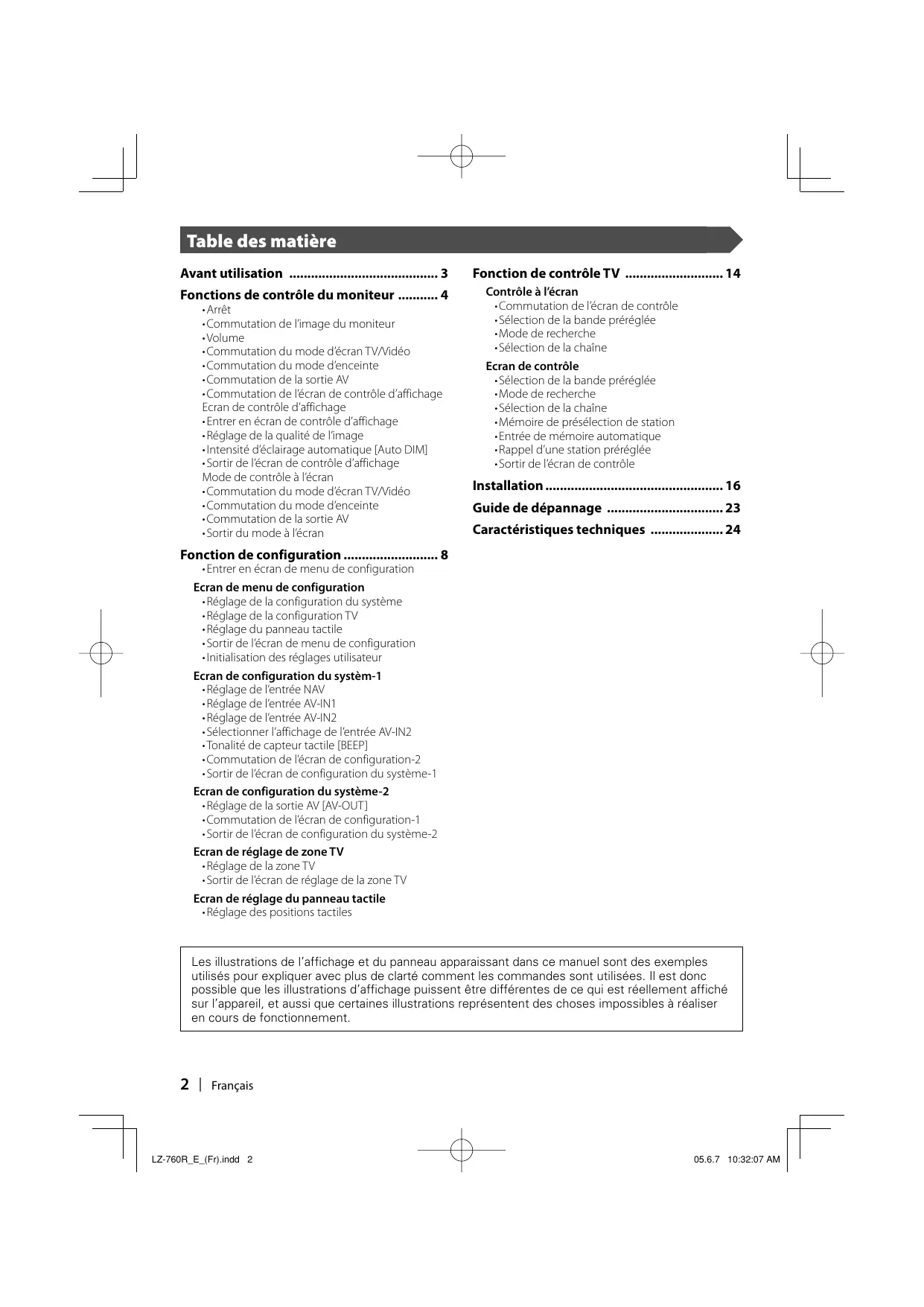 - Des réglages de qualité d’image différents peuvent être enregistrés pour la télévision, la vidéo, les écrans de contrôle et les écrans de navigation. 6 | Français LZ-760R̲E̲(Fr).indd 6