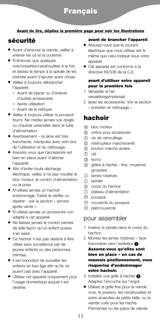 avant de brancher l’appareil Assurez-vous que le courant électrique que vous utilisez est le même que celui indiqué sous votre appareil. Cet appareil est conforme à la directive 89/336 de la C.E. avant d’utiliser votre appareil pour la première fois 1 Verwijder al het verpakkingsmateriaal. 2 lavez les accessoires. Voir la section « entretien et nettoyage » hachoir