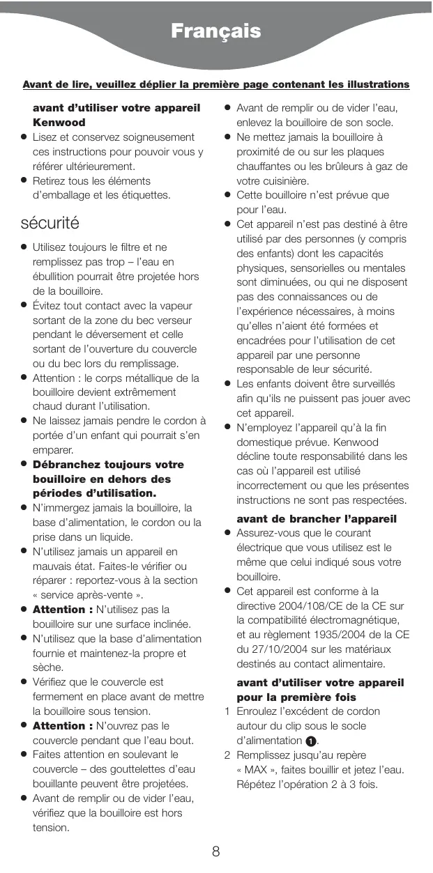Avant de remplir ou de vider l’eau, enlevez la bouilloire de son socle. Ne mettez jamais la bouilloire à proximité de ou sur les plaques chauffantes ou les brûleurs à gaz de votre cuisinière. Cette bouilloire n’est prévue que pour l’eau. Cet appareil n’est pas destiné à être utilisé par des personnes (y compris des enfants) dont les capacités physiques, sensorielles ou mentales sont diminuées, ou qui ne disposent pas des connaissances ou de l’expérience nécessaires, à moins qu’elles n’aient été formées et encadrées pour l’utilisation de cet appareil par une personne responsable de leur sécurité. Les enfants doivent être surveillés afin qu'ils ne puissent pas jouer avec cet appareil. N’employez l’appareil qu’à la fin domestique prévue. Kenwood décline toute responsabilité dans les cas où l’appareil est utilisé incorrectement ou que les présentes instructions ne sont pas respectées. avant de brancher l’appareil Assurez-vous que le courant électrique que vous utilisez est le même que celui indiqué sous votre bouilloire. Cet appareil est conforme à la directive 2004/108/CE de la CE sur la compatibilité électromagnétique, et au règlement 1935/2004 de la CE du 27/10/2004 sur les matériaux destinés au contact alimentaire. avant d’utiliser votre appareil pour la première fois 1 Enroulez l’excédent de cordon autour du clip sous le socle d’alimentation . 2 Remplissez jusqu’au repère « MAX », faites bouillir et jetez l’eau. Répétez l’opération 2 à 3 fois.