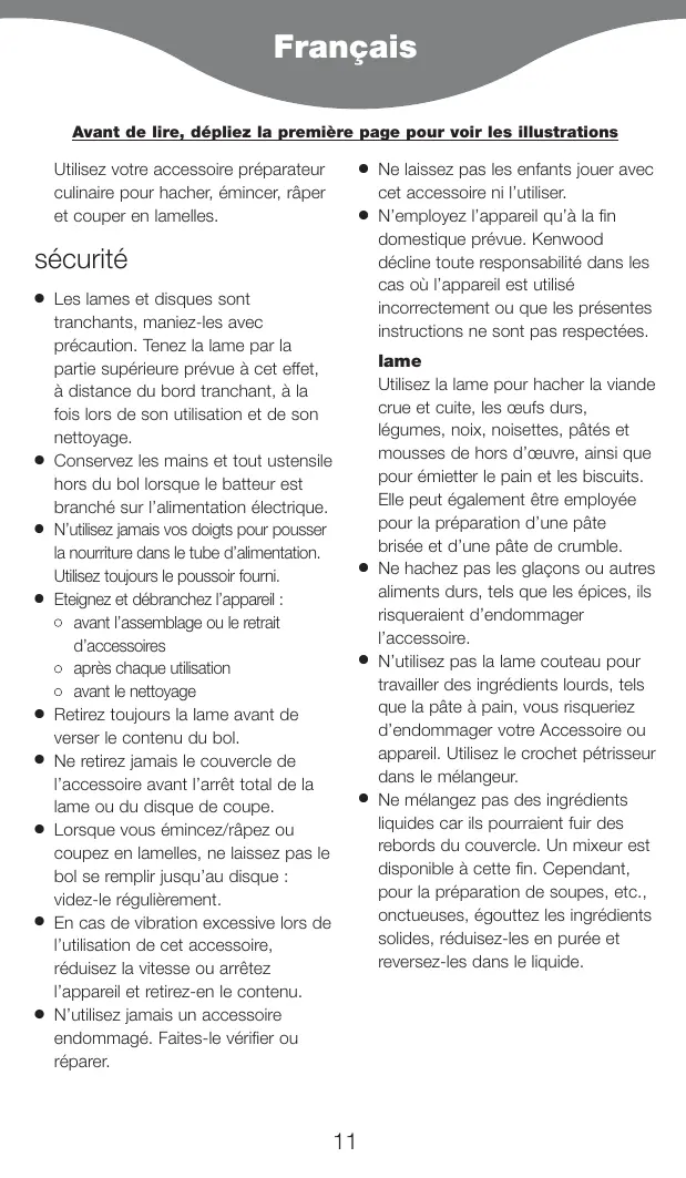 Les lames et disques sont tranchants, maniez-les avec précaution. Tenez la lame par la partie supérieure prévue à cet effet, à distance du bord tranchant, à la fois lors de son utilisation et de son nettoyage. Conservez les mains et tout ustensile hors du bol lorsque le batteur est branché sur l’alimentation électrique. N’utilisez jamais vos doigts pour pousser la nourriture dans le tube d’alimentation. Utilisez toujours le poussoir fourni. Eteignez et débranchez l’appareil : ● avant l’assemblage ou le retrait d’accessoires ● après chaque utilisation ● avant le nettoyage Retirez toujours la lame avant de verser le contenu du bol. Ne retirez jamais le couvercle de l’accessoire avant l’arrêt total de la lame ou du disque de coupe. Lorsque vous émincez/râpez ou coupez en lamelles, ne laissez pas le bol se remplir jusqu’au disque : videz-le régulièrement. En cas de vibration excessive lors de l’utilisation de cet accessoire, réduisez la vitesse ou arrêtez l’appareil et retirez-en le contenu. N’utilisez jamais un accessoire endommagé. Faites-le vérifier ou réparer.