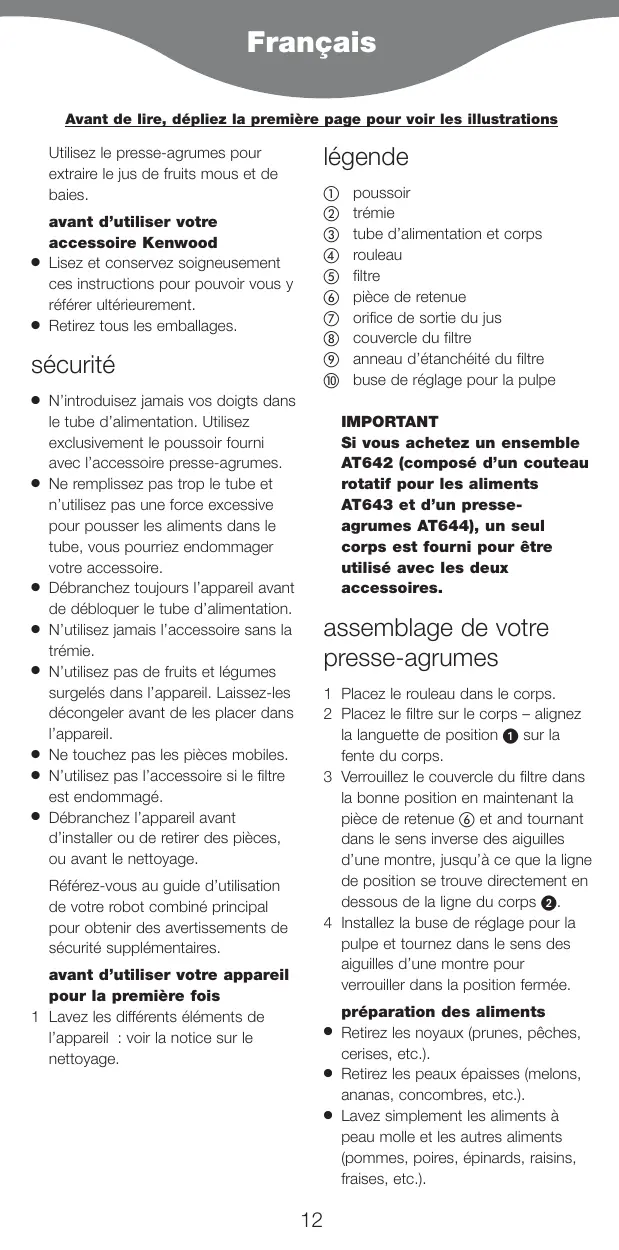 poussoir trémie tube d’alimentation et corps rouleau filtre pièce de retenue orifice de sortie du jus couvercle du filtre anneau d’étanchéité du filtre buse de réglage pour la pulpe avant d’utiliser votre accessoire Kenwood Lisez et conservez soigneusement ces instructions pour pouvoir vous y référer ultérieurement. Retirez tous les emballages. sécurité