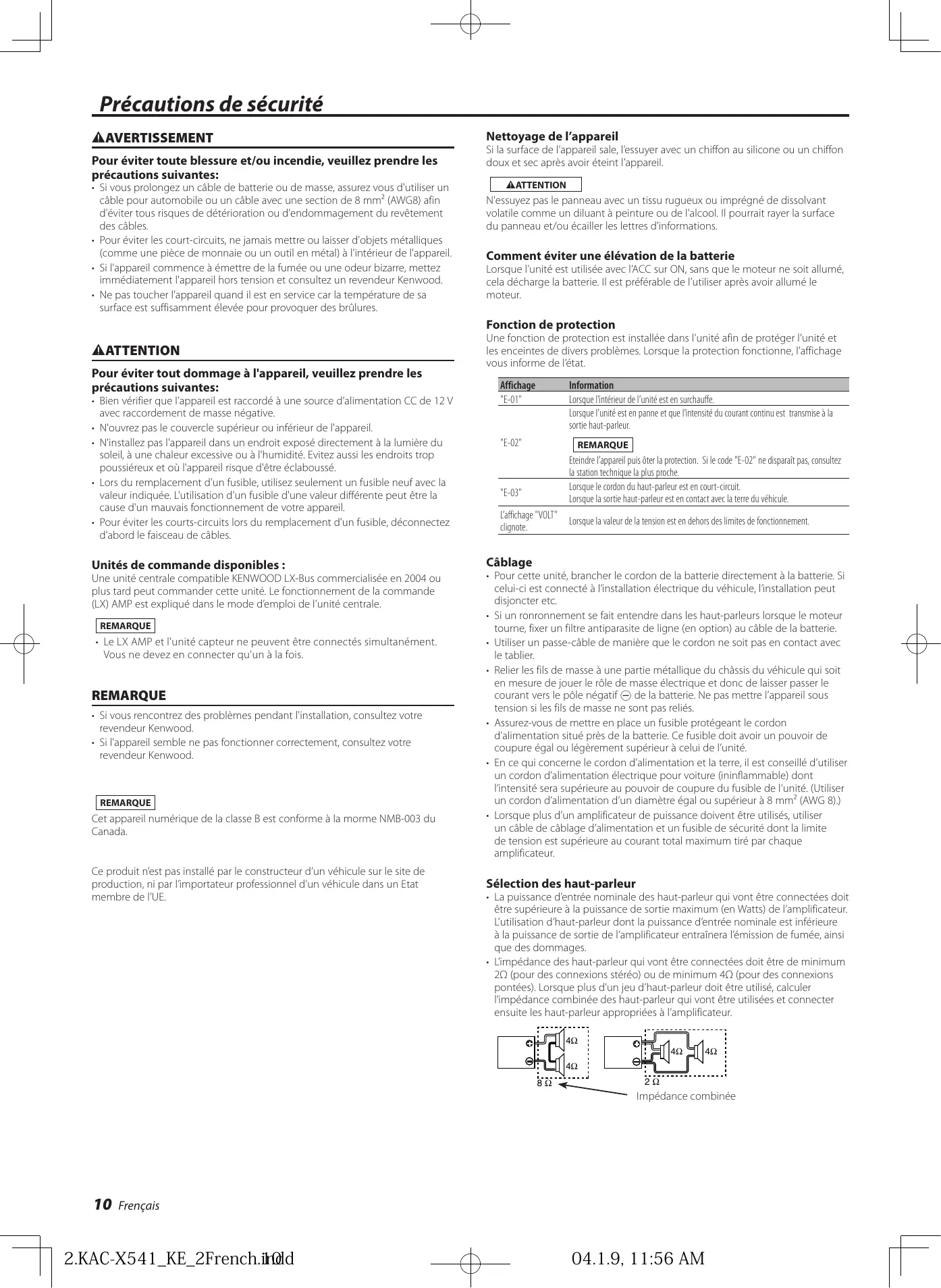 - Ne pas toucher l’appareil quand il est en service car la température de sa surface est suffisamment élevée pour provoquer des brûlures. N'essuyez pas le panneau avec un tissu rugueux ou imprégné de dissolvant volatile comme un diluant à peinture ou de l'alcool. Il pourrait rayer la surface du panneau et/ou écailler les lettres d'informations. Comment éviter une élévation de la batterie Lorsque l’unité est utilisée avec l’ACC sur ON, sans que le moteur ne soit allumé, cela décharge la batterie. Il est préférable de l’utiliser après avoir allumé le moteur. Fonction de protection Une fonction de protection est installée dans l’unité afin de protéger l’unité et les enceintes de divers problèmes. Lorsque la protection fonctionne, l’affichage vous informe de l’état. 2ATTENTION Pour éviter tout dommage à l'appareil, veuillez prendre les précautions suivantes: Affichage "E-01"