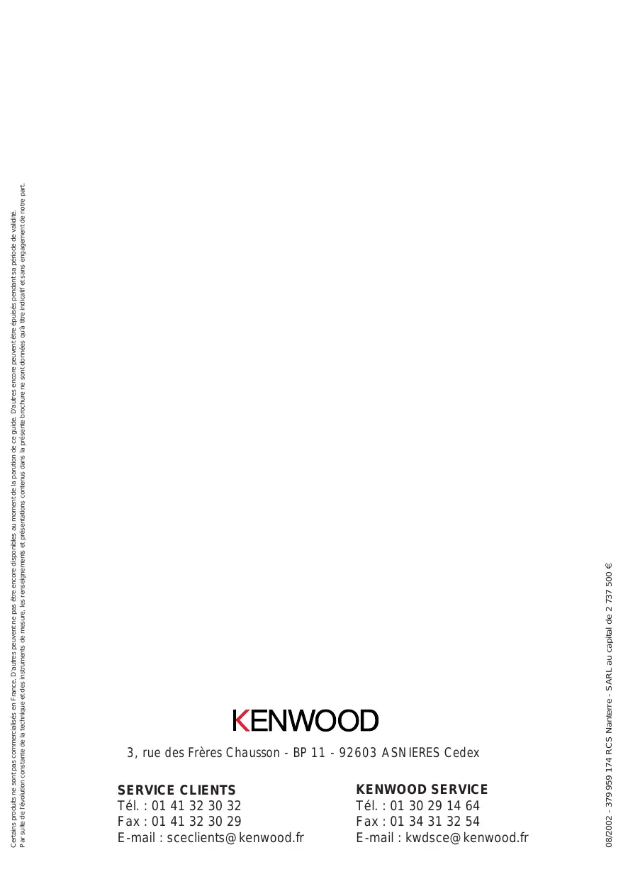 Certains produits ne sont pas commercialisés en France. D’autres peuvent ne pas être encore disponibles au moment de la parution de ce guide. D’autres encore peuvent être épuisés pendant sa période de validité. Par suite de l’évolution constante de la technique et des instruments de mesure, les renseignements et présentations contenus dans la présente brochure ne sont données qu’à titre indicatif et sans engagement de notre part. SERVICE CLIENTS Tél. : 01 41 32 30 32 Fax : 01 41 32 30 29 E-mail : sceclients@kenwood.fr KENWOOD SERVICE Tél. : 01 30 29 14 64 Fax : 01 34 31 32 54 E-mail : kwdsce@kenwood.fr 08/2002 - 379 959 174 RCS Nanterre - SARL au capital de 2 737 500 € 3, rue des Frères Chausson - BP 11 - 92603 ASNIERES Cedex R ecettes Livret