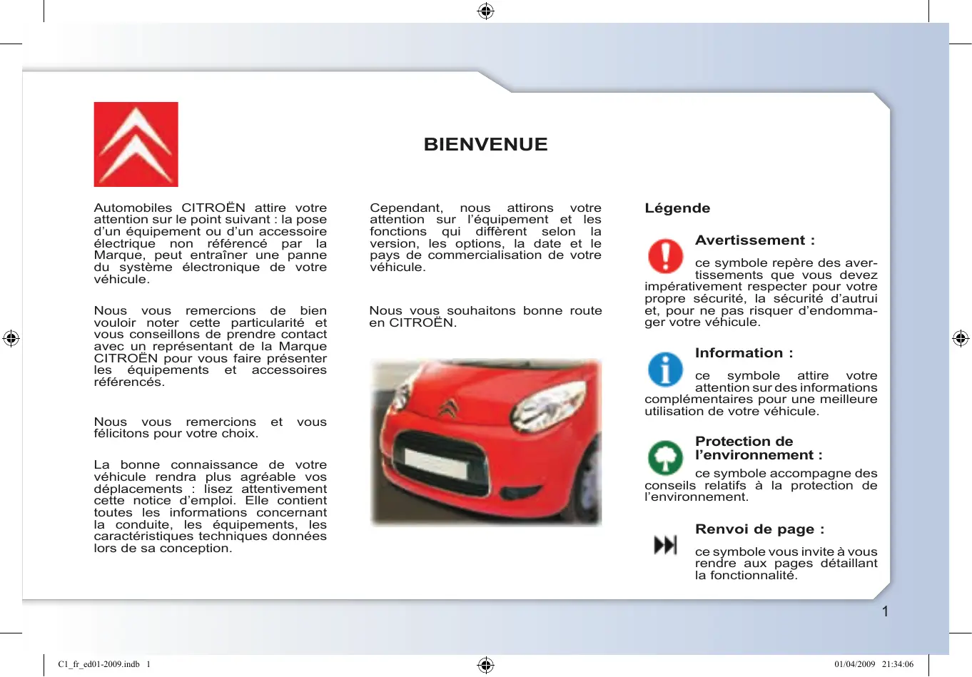 Création 4Dconcept - Automobiles CITROËN - RCS PARIS 642 050 199 - Imp. en UE C1_fr_ed01-2009.indb 3 01/04/2009 21:34:04 FR. 09.C1.0010 C1_fr_ed01-2009.indb 4 Français 01/04/2009 21:34:05 BIENVENUE Automobiles CITROËN attire votre attention sur le point suivant : la pose d’un équipement ou d’un accessoire électrique non référencé par la Marque, peut entraîner une panne du système électronique de votre véhicule. Cependant, nous attirons votre attention sur l’équipement et les fonctions qui diffèrent selon la version, les options, la date et le pays de commercialisation de votre véhicule. Nous vous remercions de bien vouloir noter cette particularité et vous conseillons de prendre contact avec un représentant de la Marque CITROËN pour vous faire présenter les équipements et accessoires référencés. Nous vous souhaitons bonne route en CITROËN. Nous vous remercions et félicitons pour votre choix. vous La bonne connaissance de votre véhicule rendra plus agréable vos déplacements : lisez attentivement cette notice d’emploi. Elle contient toutes les informations concernant la conduite, les équipements, les caractéristiques techniques données lors de sa conception. Légende