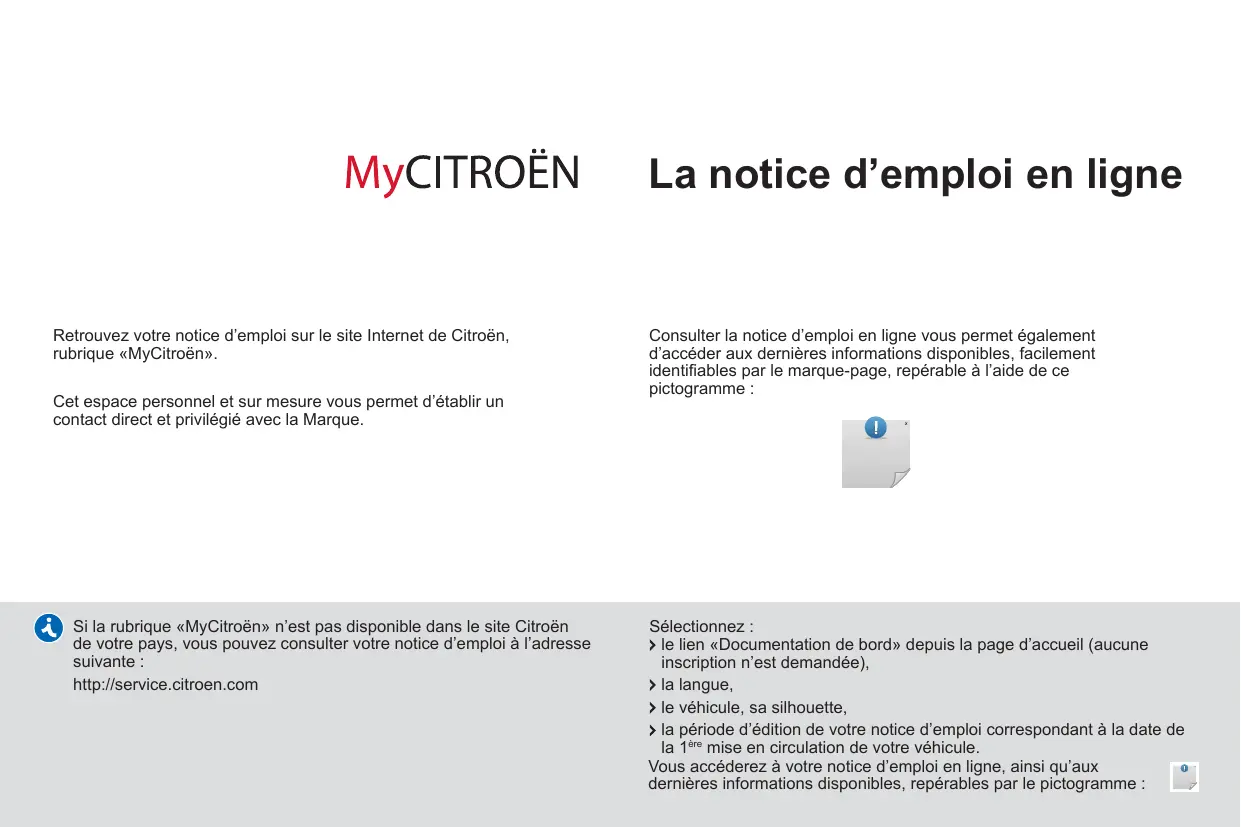 La notice d’emploi en ligne Retrouvez votre notice d’emploi sur le site Internet de Citroën, rubrique «MyCitroën». Cet espace personnel et sur mesure vous permet d’établir un contact direct et privilégié avec la Marque. Si la rubrique «MyCitroën» n’est pas disponible dans le site Citroën de votre pays, vous pouvez consulter votre notice d’emploi à l’adresse suivante : http://service.citroen.com Consulter la notice d’emploi en ligne vous permet également d’accéder aux dernières informations disponibles, facilement identifiables par le marque-page, repérable à l’aide de ce pictogramme : Sélectionnez : le lien «Documentation de bord» depuis la page d’accueil (aucune inscription n’est demandée), la langue, le véhicule, sa silhouette, la période d’édition de votre notice d’emploi correspondant à la date de la 1ère mise en circulation de votre véhicule. Vous accéderez à votre notice d’emploi en ligne, ainsi qu’aux dernières informations disponibles, repérables par le pictogramme : Nous attirons votre attention... Votre véhicule reprend une partie des équipements décrits dans ce document, en fonction du niveau de finition, de la version et des caractéristiques propres au pays de commercialisation. Citroën présente, sur tous les continents, La pose d’un équipement ou d’un accessoire électrique non référencé par Citroën, peut entraîner une panne du système électronique de votre véhicule. Veuillez noter cette particularité et prendre contact avec un représentant de la marque Citroën pour vous faire présenter les équipements et accessoires référencés. pour une approche moderne et créative de la mobilité. une gamme riche, alliant technologie et esprit d’innovation permanent, Nous vous remercions et vous félicitons de votre choix. Au volant de votre nouveau véhicule, Légende avertissement pour la sécurité connaître chaque équipement, information complémentaire chaque commande, chaque réglage, contribution à la protection de la nature rend plus confortable et plus agréable renvoi à la page indiquée vos déplacements, vos voyages. Signalétique Bonne Route ! Cette signalétique vous permettra de distinguer les spécificités de votre véhicule : C4 Picasso Grand C4 Picasso Grand C4 Picasso 5 places Grand C4 Picasso 7 places