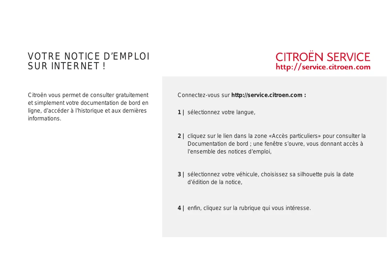 SUR INTERNET ! Citroën vous permet de consulter gratuitement et simplement votre documentation de bord en ligne, d’accéder à l’historique et aux dernières informations. Connectez-vous sur http://service.citroen.com : 1 | sélectionnez votre langue, 2 | cliquez sur le lien dans la zone «Accès particuliers» pour consulter la Documentation de bord ; une fenêtre s’ouvre, vous donnant accès à l’ensemble des notices d’emploi, 3 | sélectionnez votre véhicule, choisissez sa silhouette puis la date d’édition de la notice, 4 | enfin, cliquez sur la rubrique qui vous intéresse. Nous attirons votre attention. Chaque modèle peut ne reprendre qu’une partie des équipements mentionnés dans ce document, selon le niveau de finition, les modèles, les versions et les caractéristiques propres au pays où il est commercialisé. Citroën présente, sur tous les continents, une gamme riche, La pose d’un équipement ou d’un accessoire électrique non référencé par Citroën, peut entraîner une panne du système électronique de votre véhicule. Veuillez noter cette particularité et prendre contact avec un représentant de la marque Citroën pour vous faire présenter les équipements et accessoires référencés. alliant technologie et esprit d’innovation permanent, pour une approche moderne et créative de la mobilité. Nous vous remercions et vous félicitons de votre choix. Au volant de votre nouveau véhicule, connaître chaque équipement, Légende