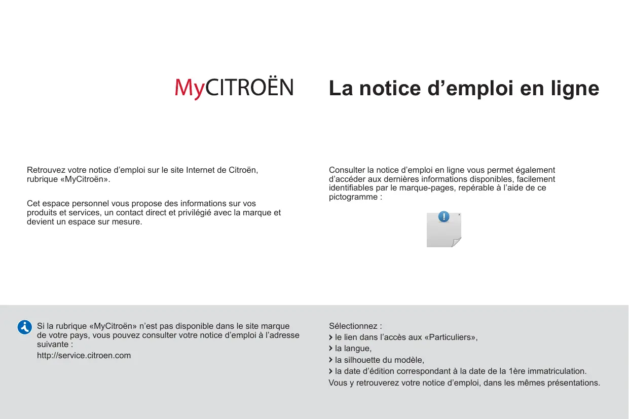 La notice d’emploi en ligne Retrouvez votre notice d’emploi sur le site Internet de Citroën, rubrique «MyCitroën». Cet espace personnel vous propose des informations sur vos produits et services, un contact direct et privilégié avec la marque et devient un espace sur mesure. Si la rubrique «MyCitroën» n’est pas disponible dans le site marque de votre pays, vous pouvez consulter votre notice d’emploi à l’adresse suivante : http://service.citroen.com Consulter la notice d’emploi en ligne vous permet également d’accéder aux dernières informations disponibles, facilement identifiables par le marque-pages, repérable à l’aide de ce pictogramme : Sélectionnez : le lien dans l’accès aux «Particuliers», la langue, la silhouette du modèle, la date d’édition correspondant à la date de la 1ère immatriculation. Vous y retrouverez votre notice d’emploi, dans les mêmes présentations. Nous attirons votre attention... Votre véhicule reprend une partie des équipements décrits dans ce document, en fonction du niveau de finition, de la version et des caractéristiques propres au pays de commercialisation. Citroën présente, sur tous les continents, une gamme riche, La pose d’un équipement ou d’un accessoire électrique non référencé par Citroën, peut entraîner une panne du système électronique de votre véhicule. Veuillez noter cette particularité et prendre contact avec un représentant de la marque Citroën pour vous faire présenter les équipements et accessoires référencés. alliant technologie et esprit d’innovation permanent, pour une approche moderne et créative de la mobilité. Nous vous remercions et vous félicitons de votre choix. Au volant de votre nouveau véhicule, connaître chaque équipement, Légende