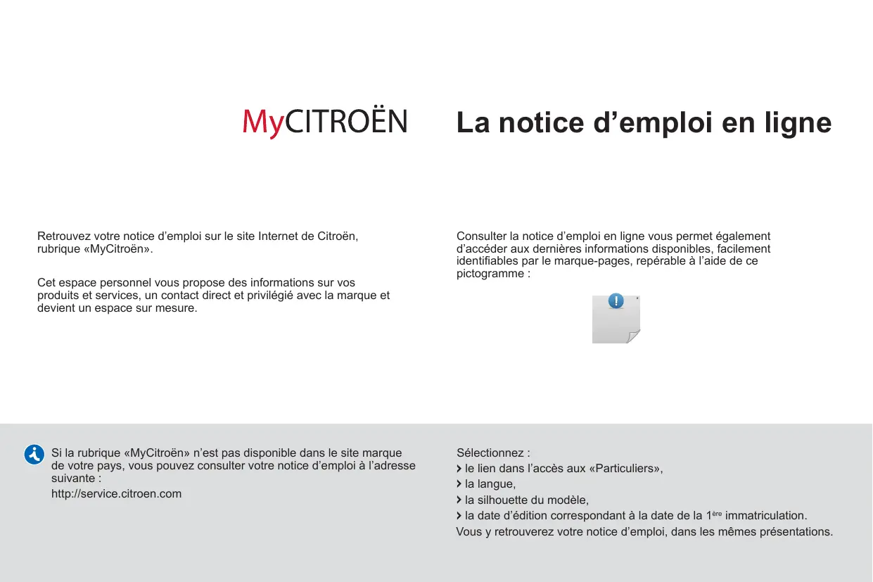 La notice d’emploi en ligne Retrouvez votre notice d’emploi sur le site Internet de Citroën, rubrique «MyCitroën». Cet espace personnel vous propose des informations sur vos produits et services, un contact direct et privilégié avec la marque et devient un espace sur mesure. Si la rubrique «MyCitroën» n’est pas disponible dans le site marque de votre pays, vous pouvez consulter votre notice d’emploi à l’adresse suivante : http://service.citroen.com Consulter la notice d’emploi en ligne vous permet également d’accéder aux dernières informations disponibles, facilement identifiables par le marque-pages, repérable à l’aide de ce pictogramme : Sélectionnez : le lien dans l’accès aux «Particuliers», la langue, la silhouette du modèle, la date d’édition correspondant à la date de la 1ère immatriculation. Vous y retrouverez votre notice d’emploi, dans les mêmes présentations. Nous attirons votre attention... Votre véhicule reprend une partie des équipements décrits dans ce document, en fonction du niveau de finition, de la version et des caractéristiques propres au pays de commercialisation. La pose d’un équipement ou d’un accessoire électrique non référencé par Citroën, peut entraîner une panne du système électronique de votre véhicule. Veuillez noter cette particularité et prendre contact avec un représentant de la marque Citroën pour vous faire présenter les équipements et accessoires référencés. Citroën présente, sur tous les continents, une gamme riche, alliant technologie et esprit d’innovation permanent, pour une approche moderne et créative de la mobilité. Nous vous remercions et vous félicitons de votre choix. Au volant de votre nouveau véhicule, connaître chaque équipement, chaque commande, chaque réglage, rend plus confortable et plus agréable vos déplacements, vos voyages. Bonne Route ! Sommaire Sommaire Légende avertissement pour la sécurité