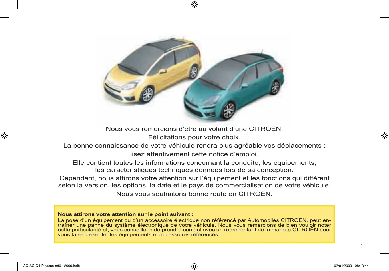Français Imprimé en UE par 02/04/2009 08:13:43 FR. 09C4P. 0010 AC-AC-C4-Picasso-ed01-2009.indb 4 Français 02/04/2009 08:13:44 Nous vous remercions d’être au volant d’une CITROËN. Félicitations pour votre choix. La bonne connaissance de votre véhicule rendra plus agréable vos déplacements : lisez attentivement cette notice d’emploi. Elle contient toutes les informations concernant la conduite, les équipements, les caractéristiques techniques données lors de sa conception. Cependant, nous attirons votre attention sur l’équipement et les fonctions qui diffèrent selon la version, les options, la date et le pays de commercialisation de votre véhicule. Nous vous souhaitons bonne route en CITROËN. Nous attirons votre attention sur le point suivant : La pose d’un équipement ou d’un accessoire électrique non référencé par Automobiles CITROËN, peut entraîner une panne du système électronique de votre véhicule. Nous vous remercions de bien vouloir noter cette particularité et, vous conseillons de prendre contact avec un représentant de la marque CITROËN pour vous faire présenter les équipements et accessoires référencés.