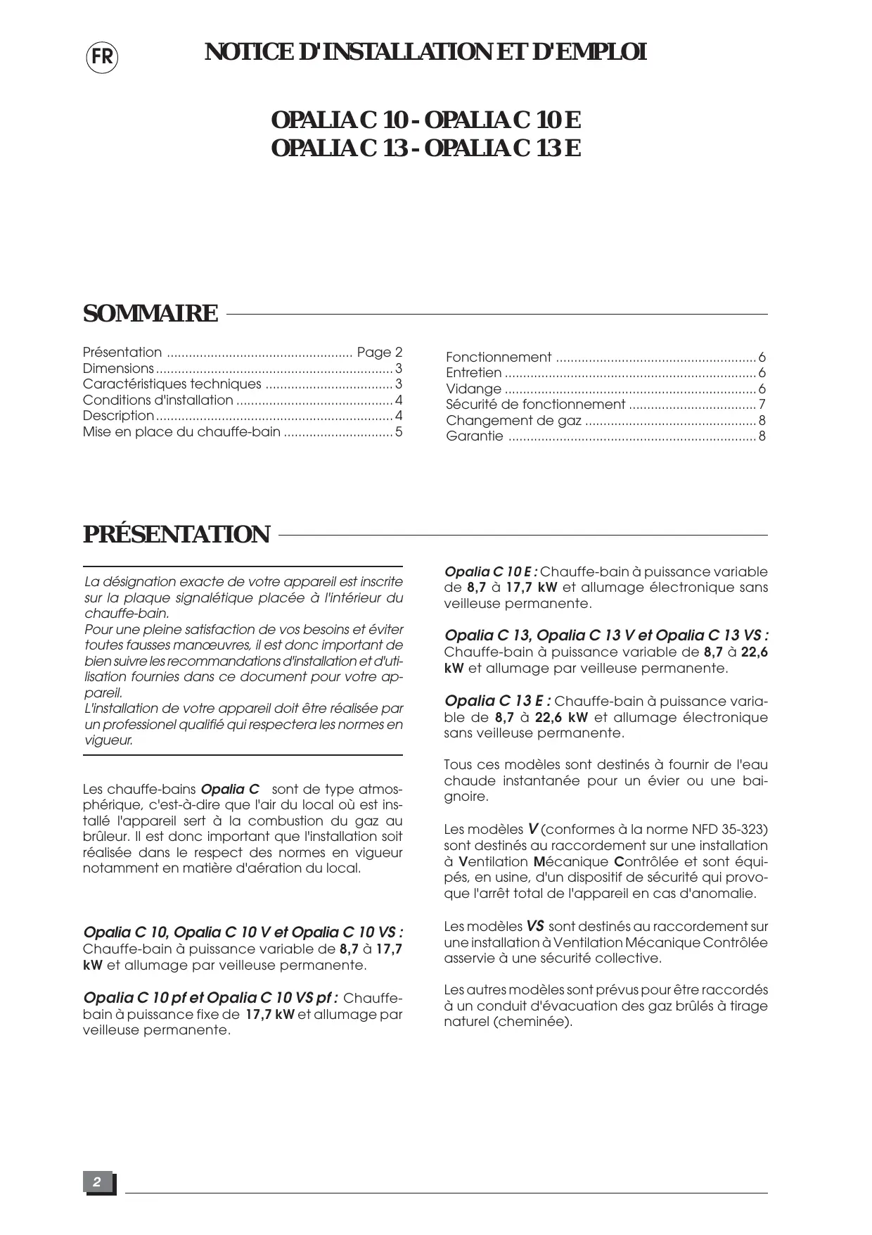 FR NOTICE D'INSTALLATION ET D'EMPLOI OPALIA C 10 - OPALIA C 10 E OPALIA C 13 - OPALIA C 13 E SOMMAIRE Présentation Page 2 Dimensions 3 Caractéristiques techniques 3 Conditions d'installation 4 Description 4 Mise en place du chauffe-bain 5