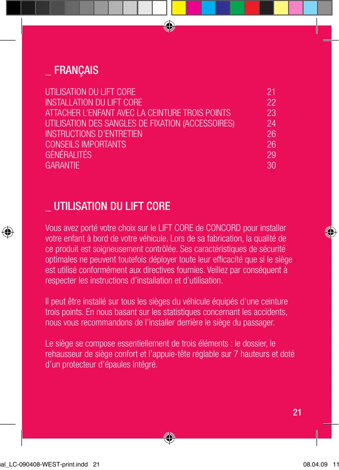 Vous avez porté votre choix sur le LIFT CORE de CONCORD pour installer votre enfant à bord de votre véhicule. Lors de sa fabrication, la qualité de ce produit est soigneusement contrôlée. Ses caractéristiques de sécurité optimales ne peuvent toutefois déployer toute leur efficacité que si le siège est utilisé conformément aux directives fournies. Veillez par conséquent à respecter les instructions d’installation et d’utilisation. Il peut être installé sur tous les sièges du véhicule équipés d’une ceinture trois points. En nous basant sur les statistiques concernant les accidents, nous vous recommandons de l’installer derrière le siège du passager. Le siège se compose essentiellement de trois éléments : le dossier, le rehausseur de siège confort et l’appuie-tête réglable sur 7 hauteurs et doté d’un protecteur d’épaules intégré. A Appuie-tête B Poignée de réglage C Guide-sangle pour ceinture diagonale C1 Crochet de sécurité D Ceinture diagonale E Dossier F Ceinture sous-abdominale G Ouverture pour ceinture H Cale de maintien avec instructions d‘utilisation I Coque d‘assise J Boucle de ceinture du véhicule _ INSTALLATION DU LIFT CORE (ILL. 6/7) Installez le LIFT CORE face à la route sur le siège ou sur la banquette du véhicule. En raison de son inclinaison, le LIFT CORE s’appuiera contre le dossier du siège sur lequel vous l’aurez placé. Pour une inclinaison plus prononcée, vous pouvez aussi rabattre la cale de maintien (H) qui reposera en bas contre le dossier de ce siège.