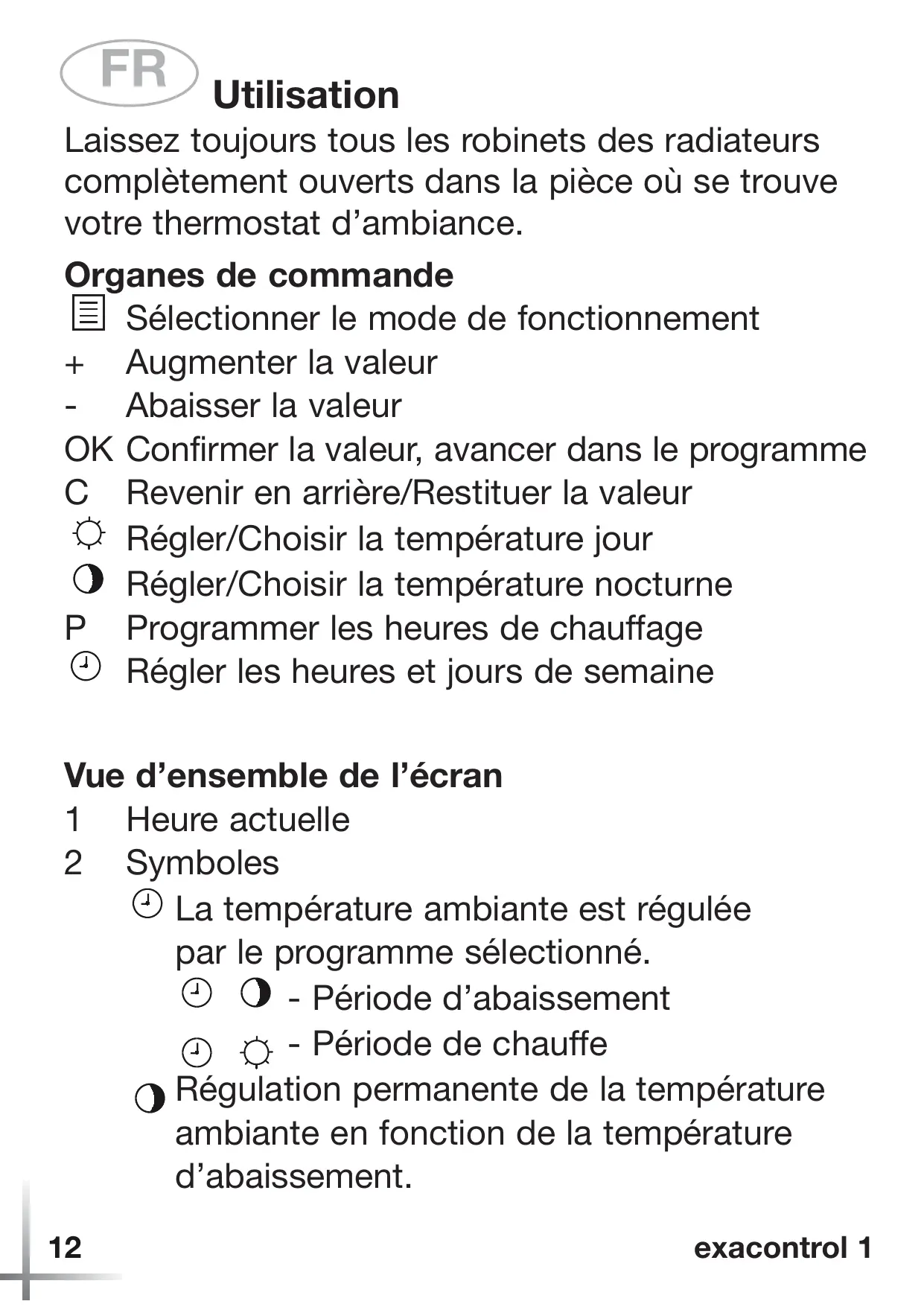 Sélectionner le mode de fonctionnement + Augmenter la valeur - Abaisser la valeur OK Confirmer la valeur, avancer dans le programme C Revenir en arrière/Restituer la valeur Régler/Choisir la température jour Régler/Choisir la température nocturne P Programmer les heures de chauffage Régler les heures et jours de semaine Vue d’ensemble de l’écran 1 Heure actuelle 2 Symboles La température ambiante est régulée par le programme sélectionné. - Période d’abaissement - Période de chauffe Régulation permanente de la température ambiante en fonction de la température d’abaissement. 12