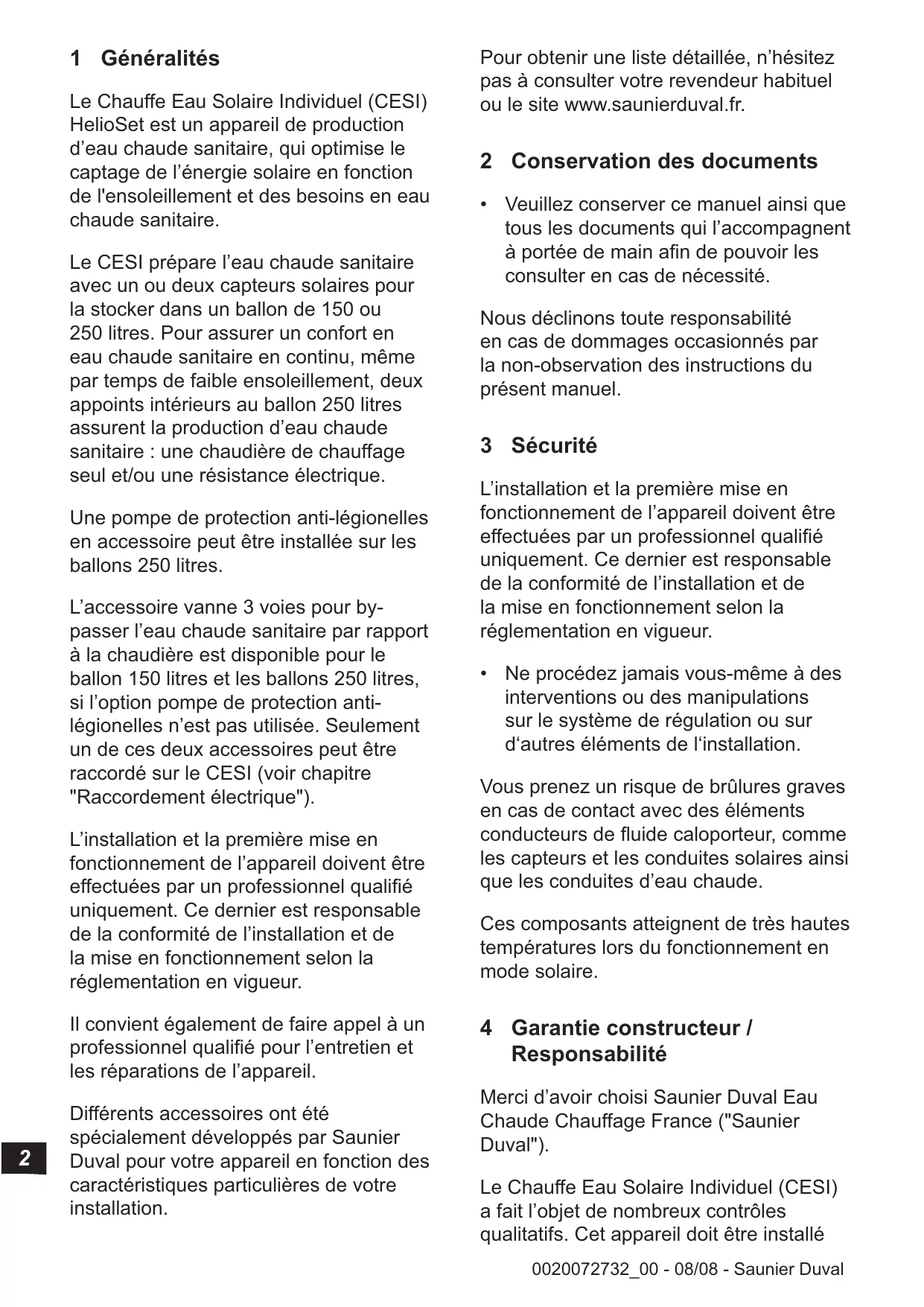- Conservez un exemplaire et transmettez le deuxième à nos services pour enregistrement de la garantie. La garantie pièces constructeur ne couvre pas : Saunier Duval vous offre une garantie pièces de : DIX ANS sur les capteurs, CINQ ANS sur les cuves, DEUX ANS sur le reste des composants, à compter de la date d’installation de votre CESI, qui couvre tout remplacement de pièce reconnue défectueuse, à l’exclusion des frais de main-d’œuvre et de déplacement. - les détériorations consécutives à des modifications de la nature ou de la pression inadéquate ou irrégulière de l’eau ou du fluide caloporteur, de la qualité de l’eau (tels que par exemple, calcaire, entartrage, embouage...) ou à un changement de caractéristiques de la tension électrique d’alimentation. Cette garantie pièces constructeur est subordonnée à un entretien annuel réalisé par un professionnel qualifié qui devra notamment vérifier, nettoyer et régler l’appareil au moins 1 fois par an, voire plus si nécessaire. L’anode du ballon doit être vérifiée et est considérée comme une pièce d’entretien courant non couvert par la Garantie. Nous nous engageons, en conséquence, à réparer ou à remplacer purement et simplement les pièces reconnues défectueuses à l’origine, après retour en nos usines pour examen. La réparation des pièces ou leur remplacement pendant la période de garantie constructeur ne peut avoir pour effet de prolonger la durée initiale de celle-ci. 0020072732_00 - 08/08 - Saunier Duval - les interventions effectuées par d’autres entreprises que celles spécialement qualifiées. - L’étendue territoriale de notre garantie est expressément limitée au territoire de la France métropolitaine pour des produits commercialisés et installés en France. - Cette garantie est consentie sans préjudice de la garantie légale de conformité du bien au contrat prévue aux articles L 211-1 et suivants du Code de la Consommation et de la garantie des vices rédhibitoires prévues aux articles 1641 à 1649 du code civil. Notice d’emploi La garantie pièces constructeur ne saurait être retenue en raison d’une mauvaise installation de l’ensemble, de conditions de stockage inappropriées ainsi qu’en cas de fonctionnement défectueux ou de détérioration du CESI résultant d’un usage anormal ou abusif, d’une insuffisance d’entretien. Manuel d’installation réservé à l’usage exclusif des professionnels qualifiés par un professionnel qualifié à même de vérifier que toutes les contraintes techniques liées au raccordement de l’appareil ainsi qu’aux caractéristiques du local où il est monté sont respectées. Toutefois, afin que vous puissiez bénéficier au mieux de ses performances, votre CESI, dès son installation, devra impérativement faire l’objet de contrôles de fonctionnement et de réglages spécifiques à l’installation sur laquelle il est raccordé.