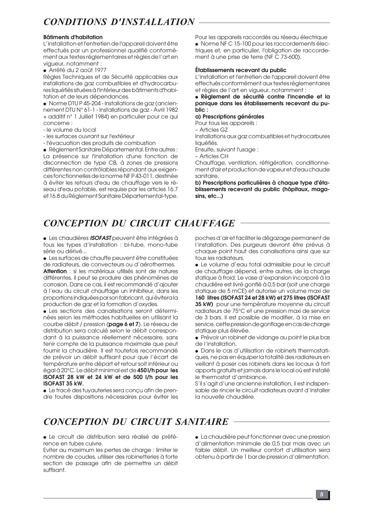 Poid net : : 52 kg Poid brut : 54 kg CONDITIONS D'INSTALLATION Bâtiments d'habitation L’installation et l'entretien de l'appareil doivent être effectués par un professionnel qualifié conformément aux textes réglementaires et règles de l’art en vigueur, notamment : ● Arrêté du 2 août 1977 Règles Techniques et de Sécurité applicables aux installations de gaz combustibles et d'hydrocarbures liquéfiés situées à l'intérieur des bâtiments d'habitation et de leurs dépendances. ● Norme DTU P 45-204 - Installations de gaz (anciennement DTU N$ 61-1 - Installations de gaz - Avril 1982 + additif n$ 1 Juillet 1984) en particulier pour ce qui concerne : - le volume du local - les surfaces ouvrant sur l'extérieur - l'évacuation des produits de combustion ● Règlement Sanitaire Départemental. Entre autres : La présence sur l'installation d'une fonction de disconnection de type CB, à zones de pressions différentes non contrôlables répondant aux exigences fonctionnelles de la norme NF P 43-011, destinée à éviter les retours d'eau de chauffage vers le réseau d'eau potable, est requise par les articles 16.7 et 16.8 du Règlement Sanitaire Départemental-type. Pour les appareils raccordés au réseau électrique ● Norme NF C 15-100 pour les raccordements électriques et, en particulier, l'obligation de raccordement à une prise de terre (NF C 73-600). Établissements recevant du public L’installation et l'entretien de l'appareil doivent être effectués conformément aux textes réglementaires et règles de l’art en vigueur, notamment : ● Règlement de sécurité contre l'incendie et la panique dans les établissements recevant du public : a) Prescriptions générales Pour tous les appareils : – Articles GZ Installations aux gaz combustibles et hydrocarbures liquéfiés. Ensuite, suivant l'usage : – Articles CH Chauffage, ventilation, réfrigération, conditionnement d'air et production de vapeur et d'eau chaude sanitaire. b) Prescriptions particulières à chaque type d'établissements recevant du public (hôpitaux, magasins, etc...)