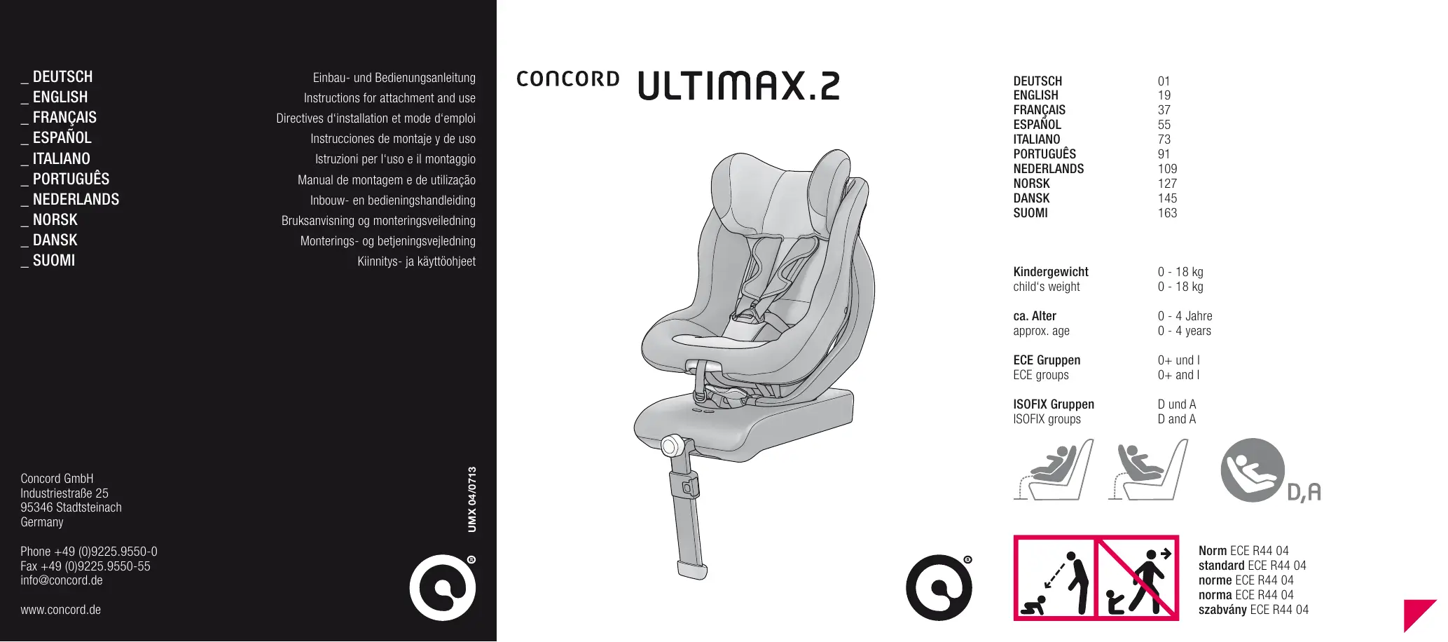 + Afin de réduire les risques de blessures en cas d'accident, fixez les bagages et autres objets. Le manuel d'utilisation doit toujours accompagner le siège-auto. L'utilisation d'accessoires et de pièces autres que les pièces d'origine n'est pas autorisée et entraîne l'annulation de la garantie et de la responsabilité du constructeur. Cette disposition ne concerne pas les accessoires spéciaux de CONCORD Utilisez toujours le siège-auto avec des housses d'origine: Le système de maintien a une durée d'utilisation très importante. Par conséquent, ilest parfaitement normal que les housses des sièges et autres pièces d'usure présentent une usure variable en fonction de leur durée et intensité d'utilisation et qu'il soit nécessaire de les remplacer. De ce fait, il n‘est pas possible de garantir une durée générique de maintien en état supérieure à une période de garantie de 6 mois. Pour tous vos besoins de pièces de remplacement, veuillez vous adresser à votre boutique d'articles pour bébés et enfants, aux rayons spécialisés des magasins, aux boutiques d'accessoires auto ou aux boutiques de vente par correspondance. Vous y trouverez la gamme d'accessoires complète pour sièges-auto enfants CONCORD. Le siège-auto CONCORD ULTIMAX a été contrôlé lors d'un choc frontal simulé contre un obstacle fixe, à une vitesse d'impact de 50 km/h. Ceci correspond à la norme de contrôle internationale ECE R 44 04 imposée à tous les systèmes de maintien testés. En cas d'utilisation conforme aux dispositions et de respect des instructions de montage et d'utilisation, les dispositifs d'installation doivent empêcher ou réduire les blessures aux enfants jusqu'à 4 ans ou de moins de 18 kg en cas d'accidents, quels que soient leur type et leur gravité. Un dispositif de sécurité pour enfants ne remplace pas un comportement responsable et prudent sur la route.