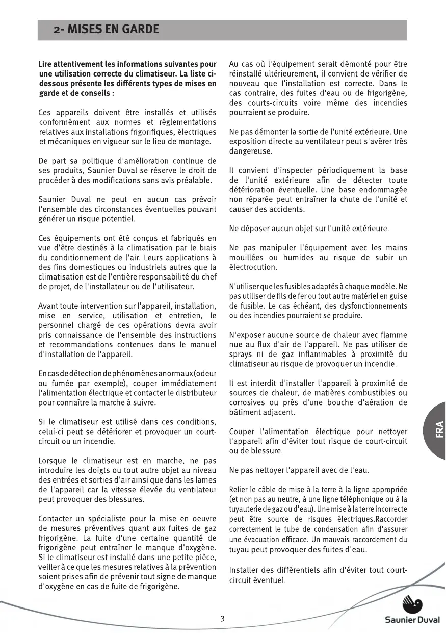 Duval recommande la réalisation d'une révision d'entretien périodique par un personnel qualifié. Ce service peut être réalisé à travers le SAT officiel de Saunier Duval qui, en fonction des besoins, offre des conditions de contrat personnalisées. L'installation frigorifique doit être réalisée avec les tuyaux spécifiques à la climatisation (ATTENTION ! Ne jamais utiliser de tuyaux de plomberie).