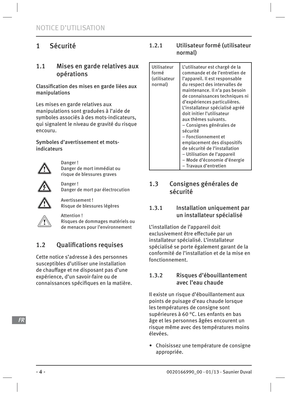 Danger en cas de dysfonctionnement ∙ Assurez-vous que l’installation de chauffage se trouve dans un état techniquement irréprochable. ∙ Assurez-vous qu’aucun dispositif de sécurité et de surveillance ne soit retiré, court-circuité ou mis hors fonction. 0020166990_00 - 01/13 - Saunier Duval ∙ Remédiez immédiatement à tous les défauts et dommages compromettant la sécurité.