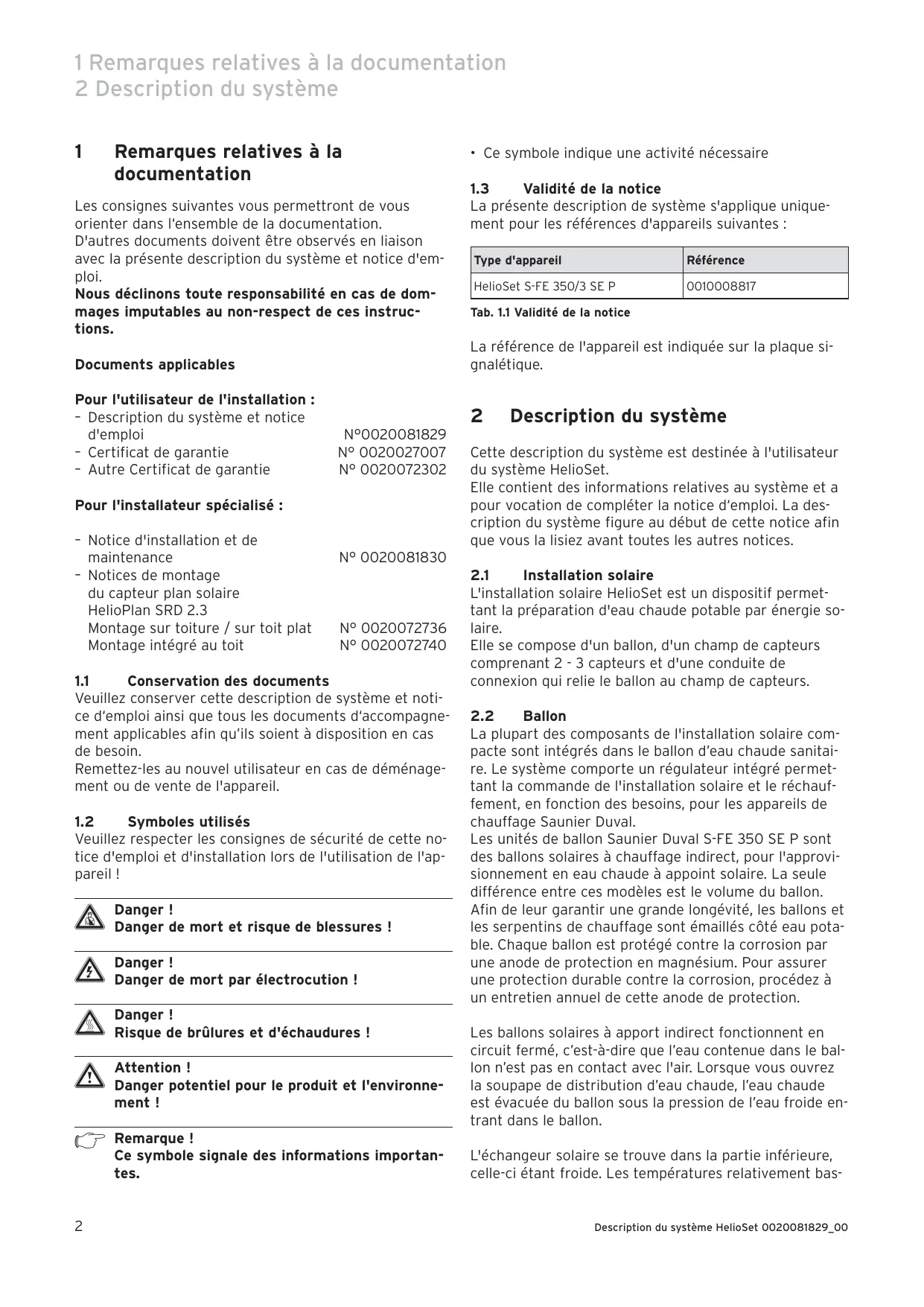 Tab. 1.1 Validité de la notice Description du système Cette description du système est destinée à l'utilisateur du système HelioSet. Elle contient des informations relatives au système et a pour vocation de compléter la notice d‘emploi. La description du système figure au début de cette notice afin que vous la lisiez avant toutes les autres notices. N° 0020081830
