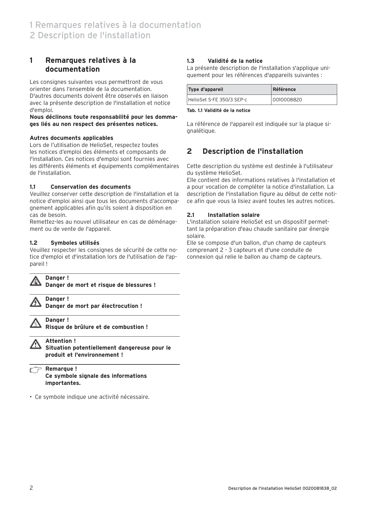 Validité de la notice La présente description de l'installation s'applique uniquement pour les références d'appareils suivantes : Type d'appareil Référence HelioSet S-FE 350/3 SEP-c
