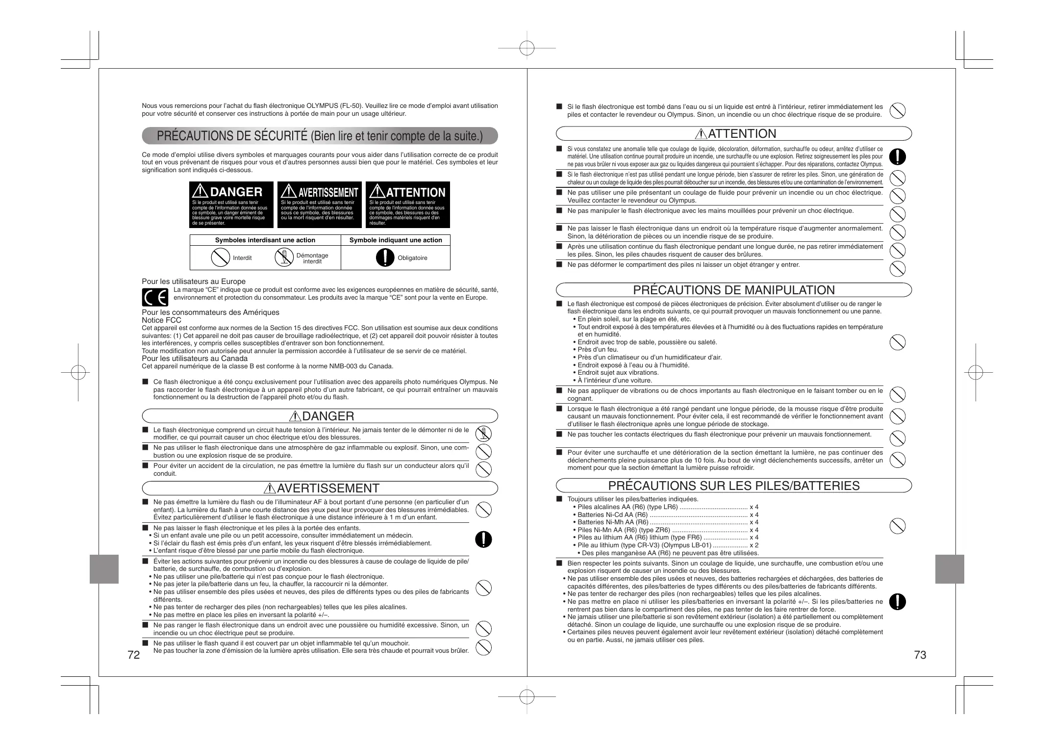 PRÉCAUTIONS SUR LES PILES/BATTERIES ■ Toujours utiliser les piles/batteries indiquées. • Piles alcalines AA (R6) (type LR6) x 4 • Batteries Ni-Cd AA (R6) x 4 • Batteries Ni-Mh AA (R6) x 4 • Piles Ni-Mn AA (R6) (type ZR6) x 4 • Piles au lithium AA (R6) lithium (type FR6) x 4 • Pile au lithium (type CR-V3) (Olympus LB-01) x 2 • Des piles manganèse AA (R6) ne peuvent pas être utilisées. ■ Bien respecter les points suivants. Sinon un coulage de liquide, une surchauffe, une combustion et/ou une explosion risquent de causer un incendie ou des blessures. • Ne pas utiliser ensemble des piles usées et neuves, des batteries rechargées et déchargées, des batteries de capacités différentes, des piles/batteries de types différents ou des piles/batteries de fabricants différents. • Ne pas tenter de recharger des piles (non rechargeables) telles que les piles alcalines. • Ne pas mettre en place ni utiliser les piles/batteries en inversant la polarité +/–. Si les piles/batteries ne rentrent pas bien dans le compartiment des piles, ne pas tenter de les faire rentrer de force. • Ne jamais utiliser une pile/batterie si son revêtement extérieur (isolation) a été partiellement ou complètement détaché. Sinon un coulage de liquide, une surchauffe ou une explosion risque de se produire. • Certaines piles neuves peuvent également avoir leur revêtement extérieur (isolation) détaché complètement ou en partie. Aussi, ne jamais utiliser ces piles.