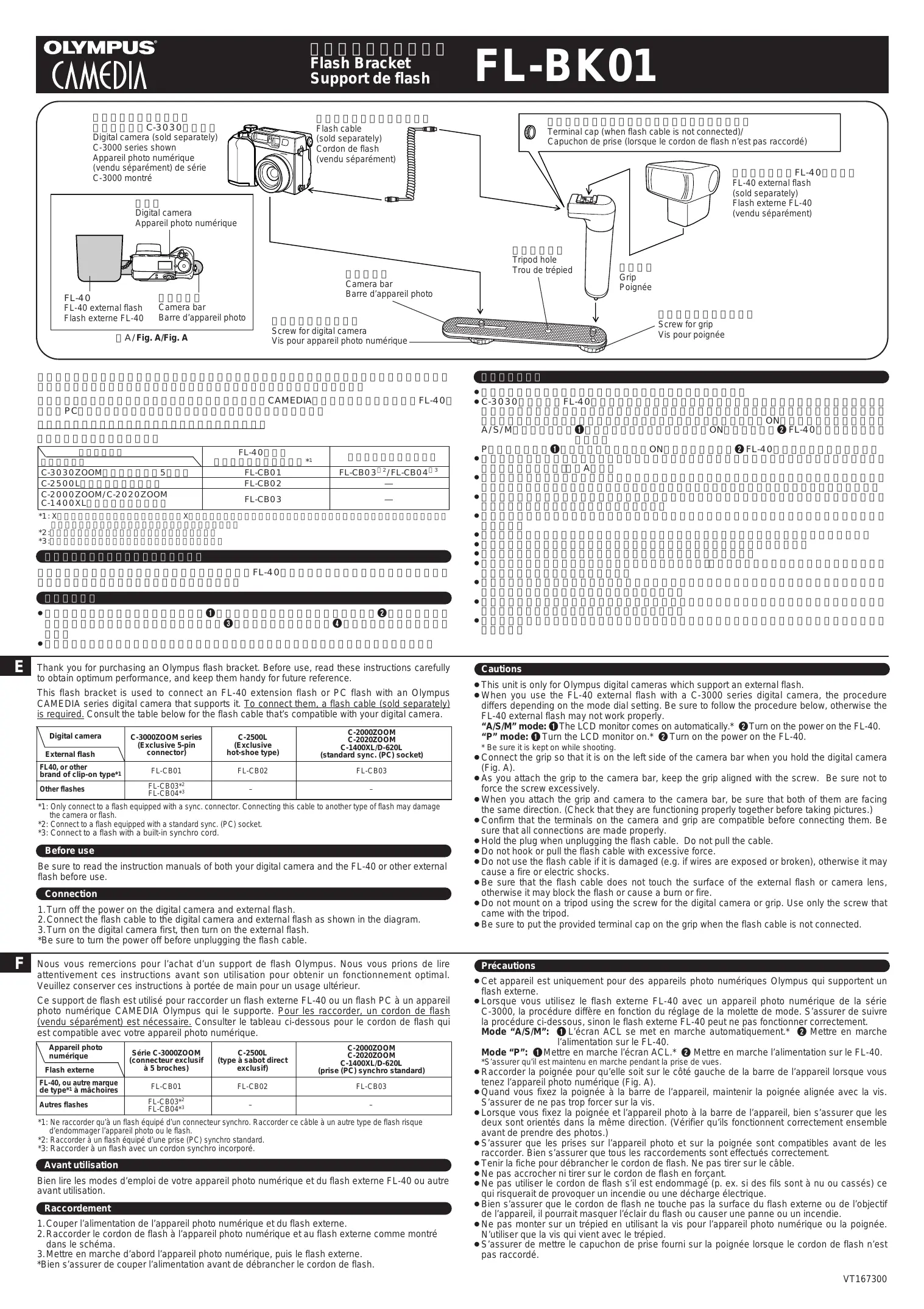 Ce support de flash est utilisé pour raccorder un flash externe FL-40 ou un flash PC à un appareil photo numérique CAMEDIA Olympus qui le supporte. Pour les raccorder, un cordon de flash (vendu séparément) est nécessaire. Consulter le tableau ci-dessous pour le cordon de flash qui est compatible avec votre appareil photo numérique. Appareil photo numérique Flash externe FL-40, ou autre marque de type*1 à mâchoires Autres flashes 3. Mettre en marche d’abord l’appareil photo numérique, puis le flash externe. *Bien s’assurer de couper l’alimentation avant de débrancher le cordon de flash.