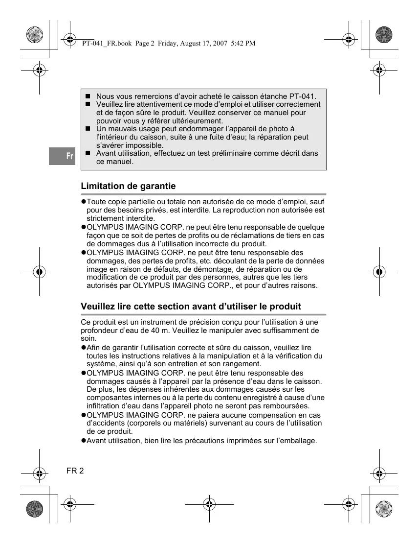 Ce produit est un instrument de précision conçu pour l’utilisation à une profondeur d’eau de 40 m. Veuillez le manipuler avec suffisamment de soin. zAfin de garantir l’utilisation correcte et sûre du caisson, veuillez lire toutes les instructions relatives à la manipulation et à la vérification du système, ainsi qu’à son entretien et son rangement. zOLYMPUS IMAGING CORP. ne peut être tenu responsable des dommages causés à l’appareil par la présence d’eau dans le caisson. De plus, les dépenses inhérentes aux dommages causés sur les composantes internes ou à la perte du contenu enregistré à cause d’une infiltration d’eau dans l’appareil photo ne seront pas remboursées. zOLYMPUS IMAGING CORP. ne paiera aucune compensation en cas d’accidents (corporels ou matériels) survenant au cours de l’utilisation de ce produit. zAvant utilisation, bien lire les précautions imprimées sur l’emballage.
