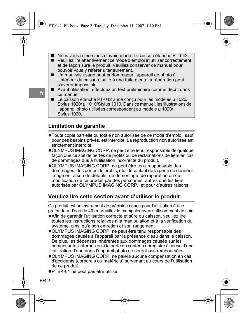 Ce produit est un instrument de précision conçu pour l’utilisation à une profondeur d’eau de 40 m. Veuillez le manipuler avec suffisamment de soin. zAfin de garantir l’utilisation correcte et sûre du caisson, veuillez lire toutes les instructions relatives à la manipulation et à la vérification du système, ainsi qu’à son entretien et son rangement. zOLYMPUS IMAGING CORP. ne peut être tenu responsable des dommages causés à l’appareil par la présence d’eau dans le caisson. De plus, les dépenses inhérentes aux dommages causés sur les composantes internes ou à la perte du contenu enregistré à cause d’une infiltration d’eau dans l’appareil photo ne seront pas remboursées. zOLYMPUS IMAGING CORP. ne paiera aucune compensation en cas d’accidents (corporels ou matériels) survenant au cours de l’utilisation de ce produit. zPTBK-01 ne peut pas être utilisé.