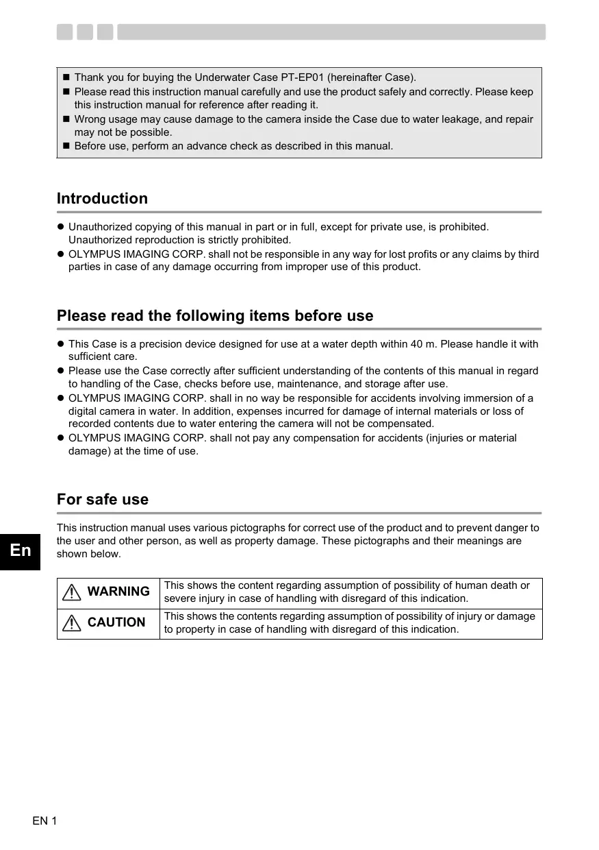 PT-EP01 - Boîtier étanche OLYMPUS - Notice d'utilisation et mode d'emploi gratuit