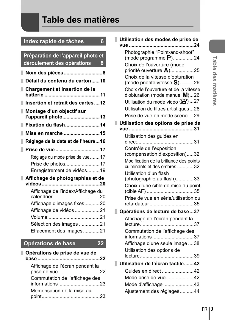 Index Nous vous remercions d’avoir acheté un appareil photo numérique Olympus. Avant de commencer à utiliser votre nouvel appareil photo, veuillez lire attentivement ces instructions afin d’optimiser ses performances et sa durée de vie. Conservez ce manuel dans un endroit sûr pour pouvoir vous y référer ultérieurement. Nous vous recommandons de prendre des photos-test pour vous habituer à votre appareil avant de commencer à prendre de photos importantes. Les captures d’écran et les illustrations de l’appareil photo présentées dans ce manuel ont été réalisées au cours des phases de développement et peuvent ne pas correspondre au produit réel. La table des matières de ce guide a été développée selon la version 1.0 du firmware pour cet appareil photo. En cas d’additions et/ou de modifications apportées aux fonctions pendant la mise à jour du firmware de l’appareil photo, le contenu sera différent. Pour obtenir les informations les plus récentes, veuillez visiter le site Web d’Olympus. Cette notice concerne le flash fourni et est tout particulièrement destinée aux utilisateurs en Amérique du Nord. Information for Your Safety IMPORTANT SAFETY INSTRUCTIONS When using your photographic equipment, basic safety precautions should always be followed, including the following: