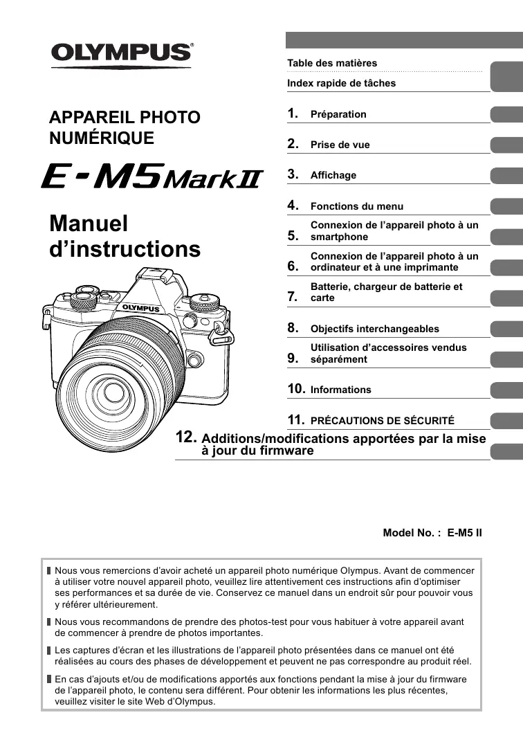 à utiliser votre nouvel appareil photo, veuillez lire attentivement ces instructions afin d’optimiser ses performances et sa durée de vie. Conservez ce manuel dans un endroit sûr pour pouvoir vous y référer ultérieurement. Nous vous recommandons de prendre des photos-test pour vous habituer à votre appareil avant de commencer à prendre de photos importantes. Les captures d’écran et les illustrations de l’appareil photo présentées dans ce manuel ont été réalisées au cours des phases de développement et peuvent ne pas correspondre au produit réel. En cas d’ajouts et/ou de modifications apportés aux fonctions pendant la mise à jour du firmware de l’appareil photo, le contenu sera différent. Pour obtenir les informations les plus récentes, veuillez visiter le site Web d’Olympus.