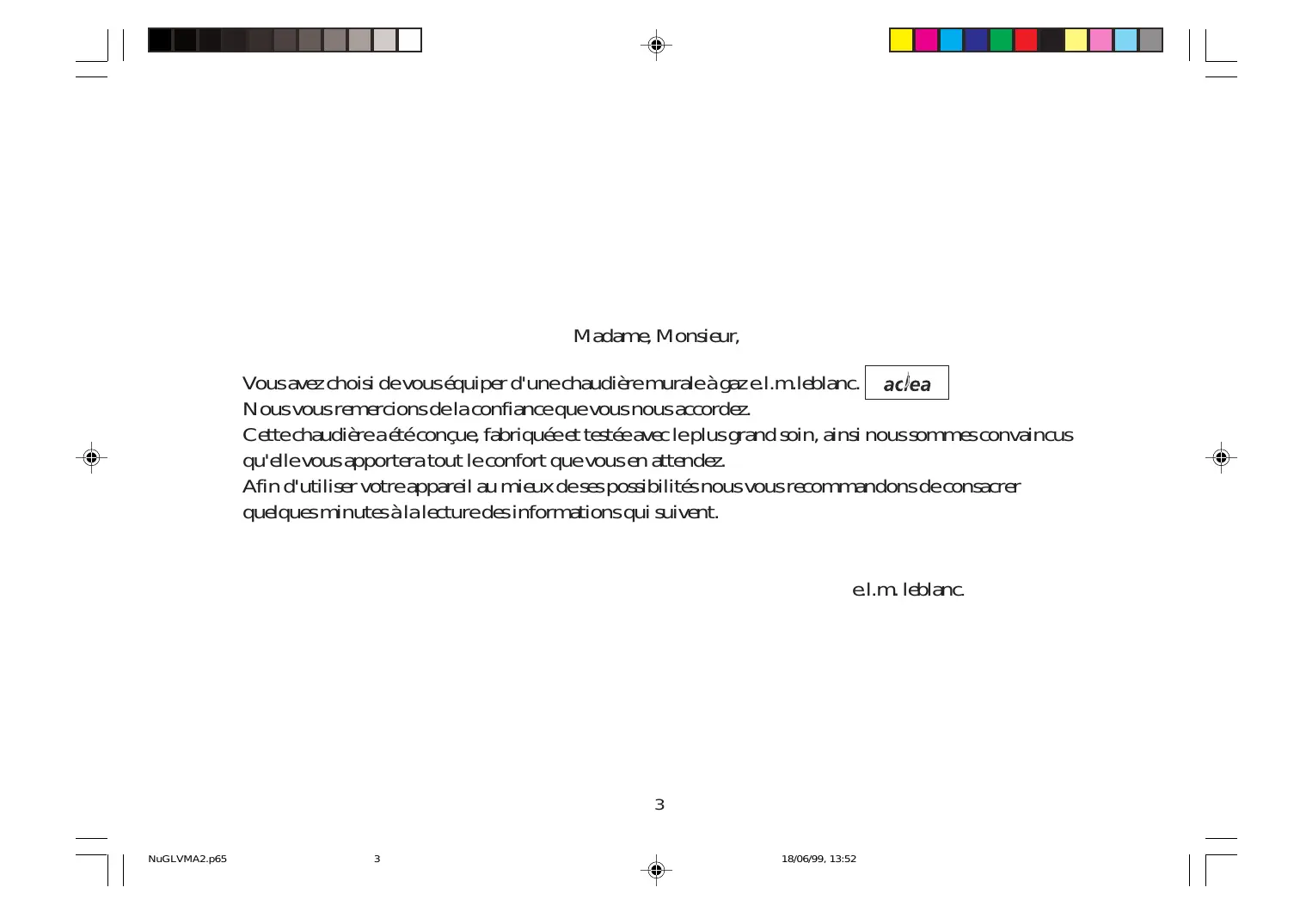 18/06/99, 13:52 Madame, Monsieur, Vous avez choisi de vous équiper d'une chaudière murale à gaz e.l.m.leblanc. Nous vous remercions de la confiance que vous nous accordez. Cette chaudière a été conçue, fabriquée et testée avec le plus grand soin, ainsi nous sommes convaincus qu'elle vous apportera tout le confort que vous en attendez. Afin d'utiliser votre appareil au mieux de ses possibilités nous vous recommandons de consacrer quelques minutes à la lecture des informations qui suivent. e.l.m. leblanc.