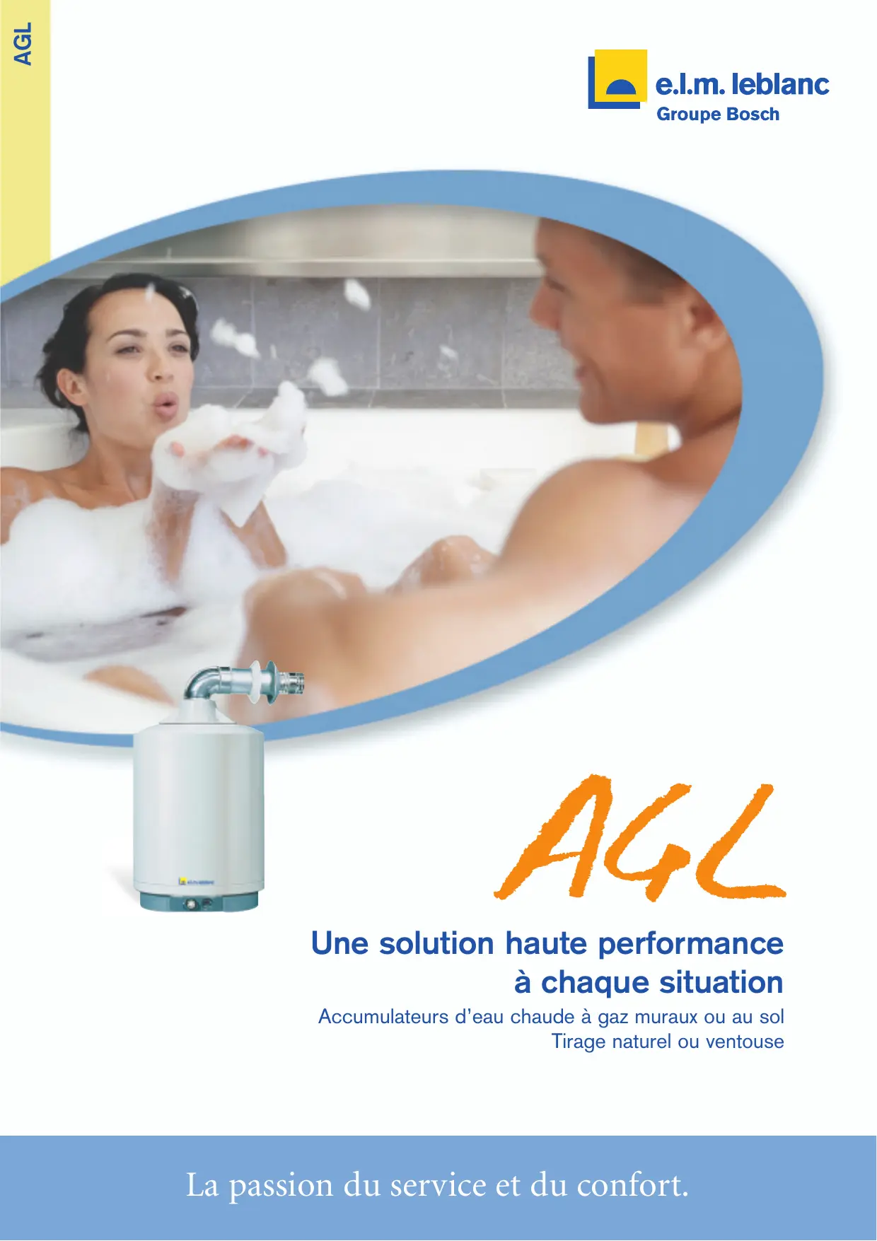 e.l.m.leblanc AGL Endurance et performances très professionnelles ! Loisirs, sport, forme et beauté… Autant de domaines professionnels et collectifs où les équipements doivent répondre à des sollicitations intensives d’eau chaude et où les accumulateurs AGL sont particulièrement dans leur élément ! Des possibilités de configurations parfaitement adaptées. Endurance, réactivité, disponibilité immédiate de l’eau chaude en grande quantité… Autant de qualités qui peuvent s’additionner en fonction des contextes et des besoins d’utilisation. Installation avec bouclage : Eau chaude instantanée. Montage en série : Addition des puissances. Montage en parallèle : Puisages simultanés à très haut débit. Installation combinée gaz/soleil : Pour concilier économie et écologie. Un confort d’eau chaude exemplaire. Aujourd’hui, le confort d’eau chaude est un critère de satisfaction essentiel qui atteint un niveau supérieur d’exigence lorsqu’il est associé à une dimension de service. Les accumulateurs AGL contribuent au bien-être de vos clients, particulièrement dans les domaines où les volumes d’eau chaude s’avèrent importants au quotidien, par exemple: Forme et beauté Instituts de beauté Centres d’esthétique Salons de coiffure Centres de remise en forme Installations de thalassothérapie Centres de soins Loisirs Hôtels Colonies de vacances Campings Sports Gymnases Clubs et salles de sport Caractéristiques AGL 9E AGL 10E Type d’appareil AGL 12E