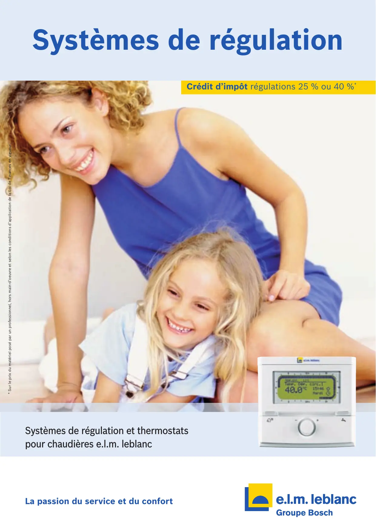 - Sur le prix du matériel posé par un professionnel, hors main-d’oeuvre et selon les conditions d’application de la Loi de Finances en vigueur. Crédit d’impôt régulations 25 % ou 40 %* Systèmes de régulation et thermostats pour chaudières e.l.m. leblanc La passion du service et du confort Réguler pour mieux chauffer et gagner en performance énergétique. Pris en compte dans le diagnostic de performance énergétique (DPE) et obligatoires dans la réglementation thermique RT 2005, les systèmes de régulation e.l.m. leblanc optimisent les performances de la chaudière pour répondre aux exigences de confort de chacun, tout en limitant la consommation d’énergie et son impact sur l’environnement. Crédit d’impôt régulations 25 % ou 40 %* La température idéale, les économies en plus. Avec un système de régulation e.l.m. leblanc, vous gérez au plus précis votre confort en déclenchant le fonctionnement de la chaudière selon vos rythmes de vie et vos horaires. Sollicitée à bon escient, elle ne consomme que l’énergie strictement nécessaire. Un facteur d’économie appréciable lorsqu’on sait qu’1 degré en trop équivaut à 7 % de consommation d’énergie supplémentaire ! FW 100 Des systèmes de régulation adaptés. La régulation ajuste la puissance de la chaudière à la température de consigne programmée selon 3 principes :