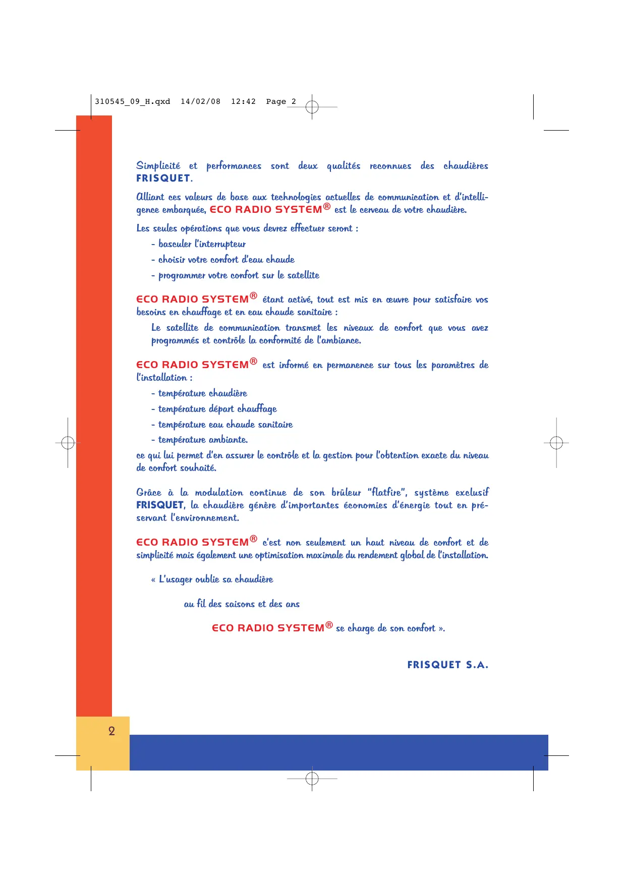 310545_09_H.qxd 14/02/08 12:42 Page 2 Simplicité et performances sont deux qualités reconnues des chaudières FRISQUET. Alliant ces valeurs de base aux technologies actuelles de communication et d’intelligence embarquée, ECO RADIO SYSTEM ® est le cerveau de votre chaudière. Les seules opérations que vous devrez effectuer seront : - basculer l’interrupteur - choisir votre confort d’eau chaude - programmer votre confort sur le satellite ECO RADIO SYSTEM ® étant activé, tout est mis en œuvre pour satisfaire vos besoins en chauffage et en eau chaude sanitaire : Le satellite de communication transmet les niveaux de confort que vous avez programmés et contrôle la conformité de l’ambiance. ECO RADIO SYSTEM ® est informé en permanence sur tous les paramètres de l’installation : - température chaudière - température départ chauffage - température eau chaude sanitaire - température ambiante. ce qui lui permet d’en assurer le contrôle et la gestion pour l’obtention exacte du niveau de confort souhaité. Grâce à la modulation continue de son brûleur “flatfire”, système exclusif FRISQUET, la chaudière génère d’importantes économies d’énergie tout en préservant l’environnement. ECO RADIO SYSTEM ® c’est non seulement un haut niveau de confort et de simplicité mais également une optimisation maximale du rendement global de l’installation. « L’usager oublie sa chaudière au fil des saisons et des ans ECO RADIO SYSTEM ® se charge de son confort ». FRISQUET S.A.