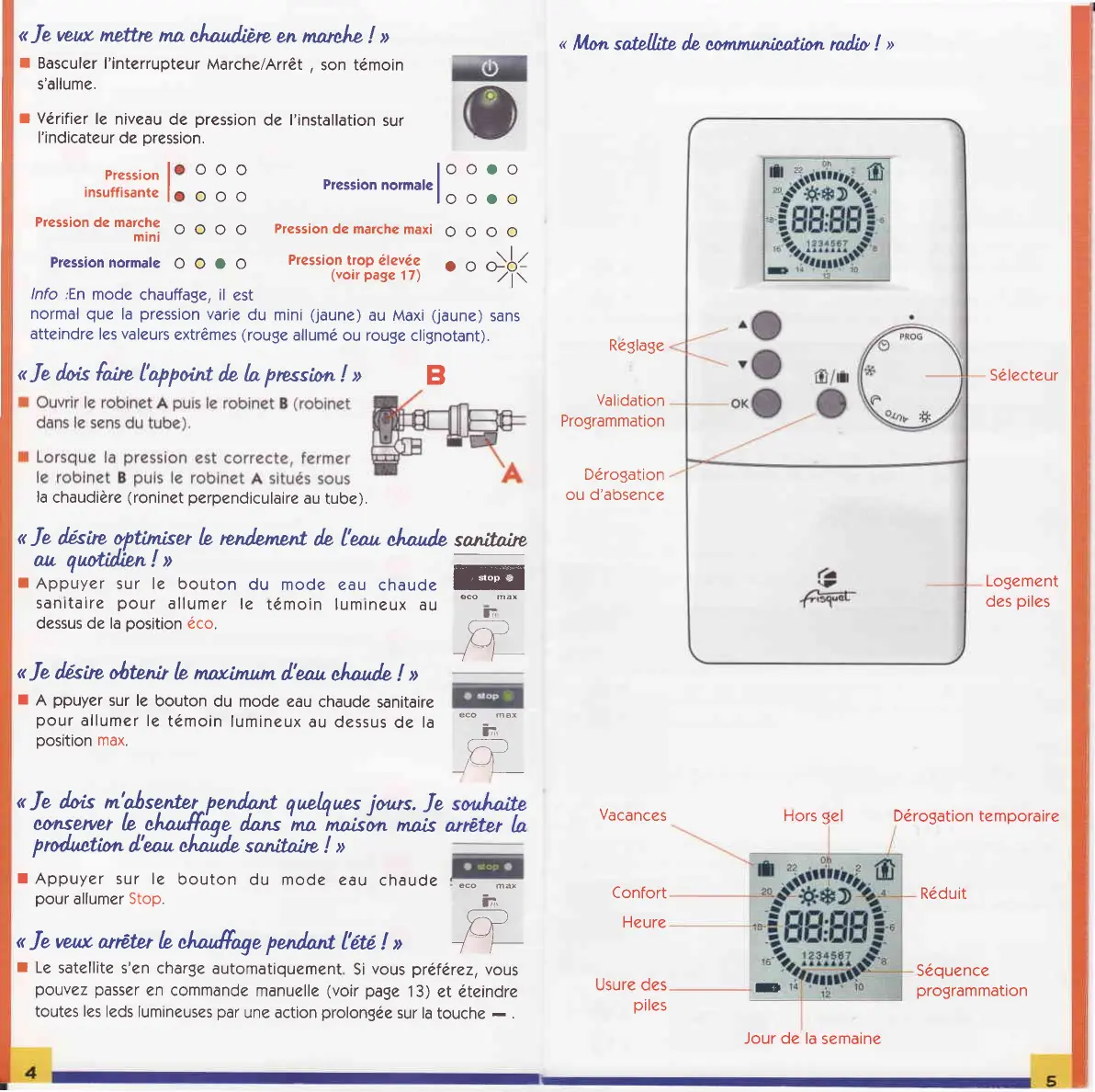e Le chouffage line fonctionne pas ou fonctionne de manière aléatoire : » Je vérifie que le satellite de communication soit correctement réglé et sur une position correspondant au mode de marche souhaité. D Je vérifie que les piles du satellite soient en bon état de marche, par précaution je les change. e Je regarde le tableau de bord : D Le clignotement d’un voyant révèle toujours un mode de fonctionnement anormal. D Le voyant vert B clignote : les gaz brûlés ne sont pas évacués correctement (voir page 17). > Le voyant M clignote : la transmission radio n'est pas reçue. D Les voyants jaunes T9, T3 ou STOP clignotent, la chaudière -_ fournit un service minimum évitant ainsi dans là plupart des cas une panne totale de chauffage. Faire appel à l'entreprise qui assure le SAV, le remplacement d'une pièce est nécessaire. » Vous êtes équipés d’une régulation RIF 5000 et AUTO clignote: la commande de la régulation est défaillante. Faire appel à l'entreprise qui assure le SAV. epression d'eau dans le circuit est insuffisante, la rétablir comme indiqué page 4. e Certains radiateurs situés au-dessus de la chaudière chauffent même l'été : » votre installation a un fonctionnement en circulation naturelle, la pose d’un clapet antithermosiphon s'impose. Je veux mettre ma chaudière en marche ! ................. .page 4 L'eau choude sanitaire … . TE ee hpagerd] Mon sotellite de communieation radio! ................... page 5 Je veux mettre l'horloge à l'heure et au jour! ............ ..page 6 Je veux modifier la température mode confort | … Je veux modifier la température mode réduit ! ............... page 6 Je veux modifier la tempéroture mode Hors gel! .............poge 7 Je désire programmer mes séquences de chauffage ! - page 7 Je rentre plus tôt à mon domirile | ....... COdado EP anbnd 1 DC Je quitte mon domieile plus tôt que le passage ou mode réduit … page 8 Je pars en vosances … .... - page © Je désire que mo. moison soit chauffée en mode confort | ..... page © Je désire que mo maison soit chauffée en mode réduit ! ...... page 9 Changement de piles ................. DOG0 PGA O0 un LP 0) | Quelles sont les réglementations en vigueur ? .............. page 11 Les conseils pratiques ! ......... DOPOOOBC doocancoooanod page 12 Caractéristiques techniques ….......................... page 15 Les incidents éventuels … ............... séssssse......page 16 Que faire si .................... SCo00060080mhn Es page 18