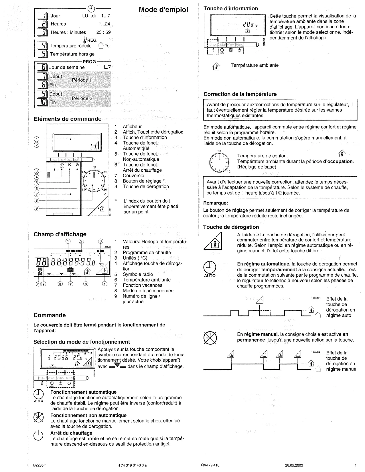 Mode d'emploi 1] Jour 1.7 — Heures 1.24 (31 Heures : Minutes 23:59 D Température réduite (}°C 1 Température hors gel PROG —— El sour de semaine 1.7 1] Début Fin EI] Début ICT Fin Période 1 Période 2 Eléments de commande Afficheur Affich, Touche de dérogation Touche d'information Touche de fonct.: Automatique