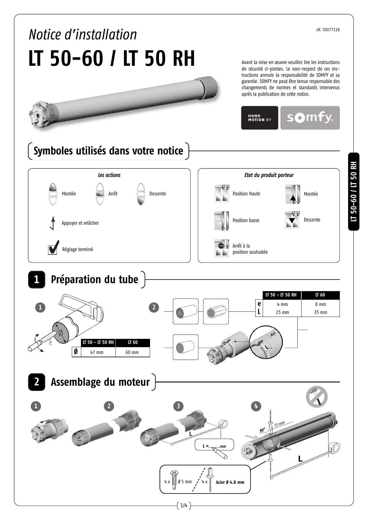 réf. 5007711B Notice d’installation LT 50-60 / LT 50 RH Avant la mise en œuvre veuillez lire les instructions de sécurité ci-jointes. Le non-respect de ces instructions annule la responsabilité de SOMFY et sa garantie. SOMFY ne peut être tenue responsable des changements de normes et standards intervenus après la publication de cette notice. Les actions Montée