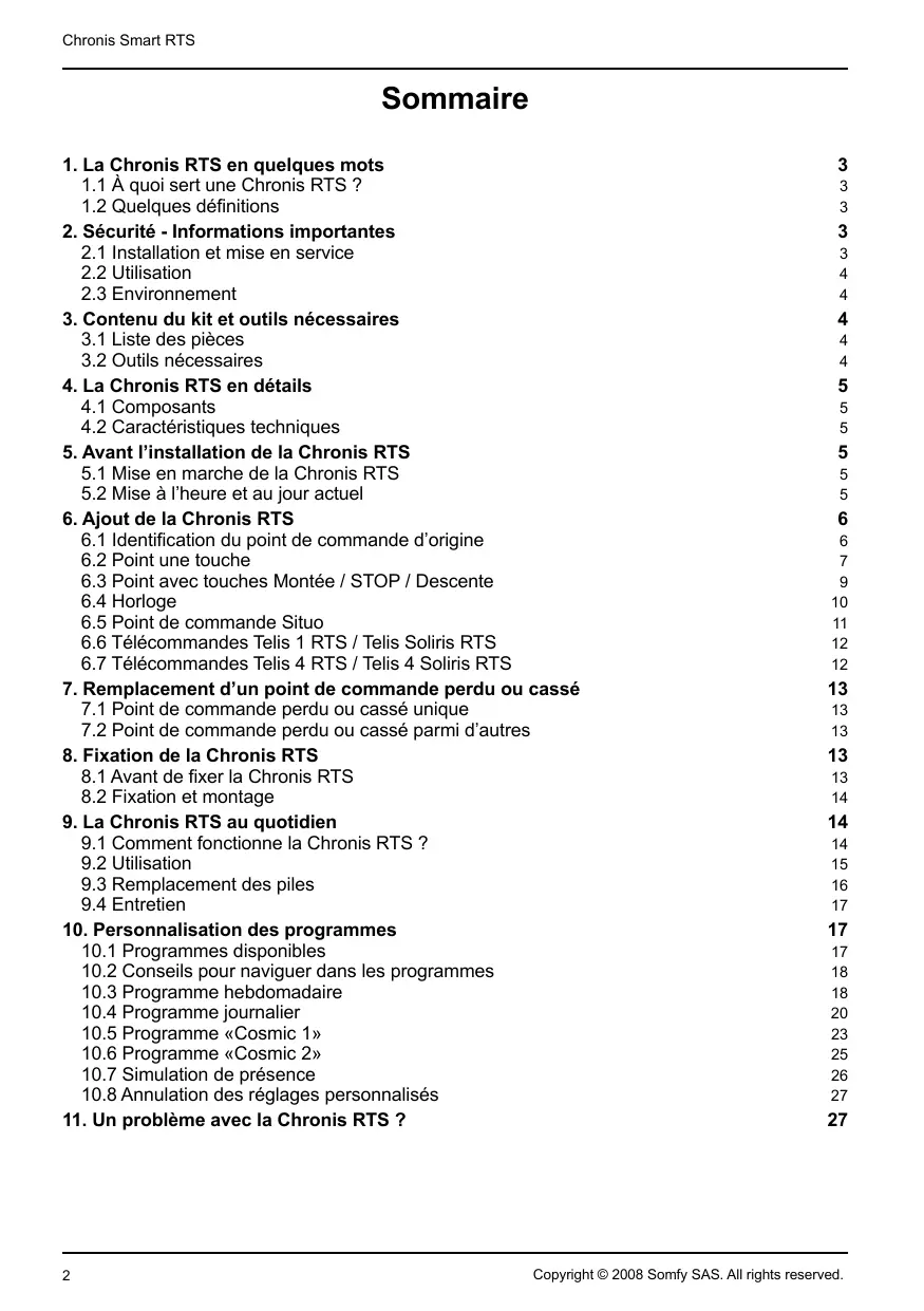 Cette notice décrit l’installation, la mise en service et le mode d’utilisation de la Chronis RTS. Avant toute installation, vérifier la compatibilité de la Chronis RTS avec les équipements et accessoires associés. Toute utilisation non conforme entraînerait l’exclusion de la responsabilité et de la garantie Somfy. Copyright © 2008 Somfy SAS. All rights reserved.