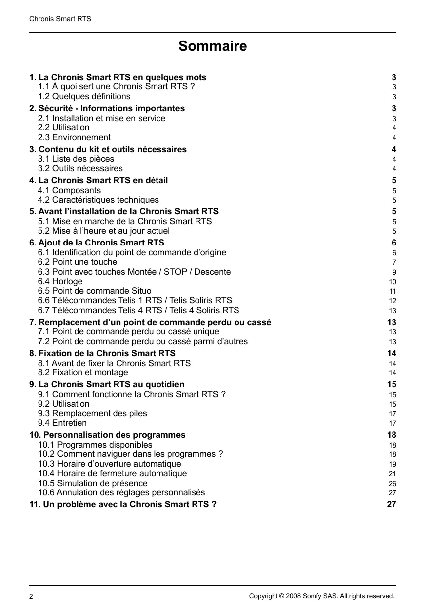 www.somfy.com Chronis Smart RTS Ref.5054477A Notice d’installation et d’utilisation Chronis Smart RTS Sommaire