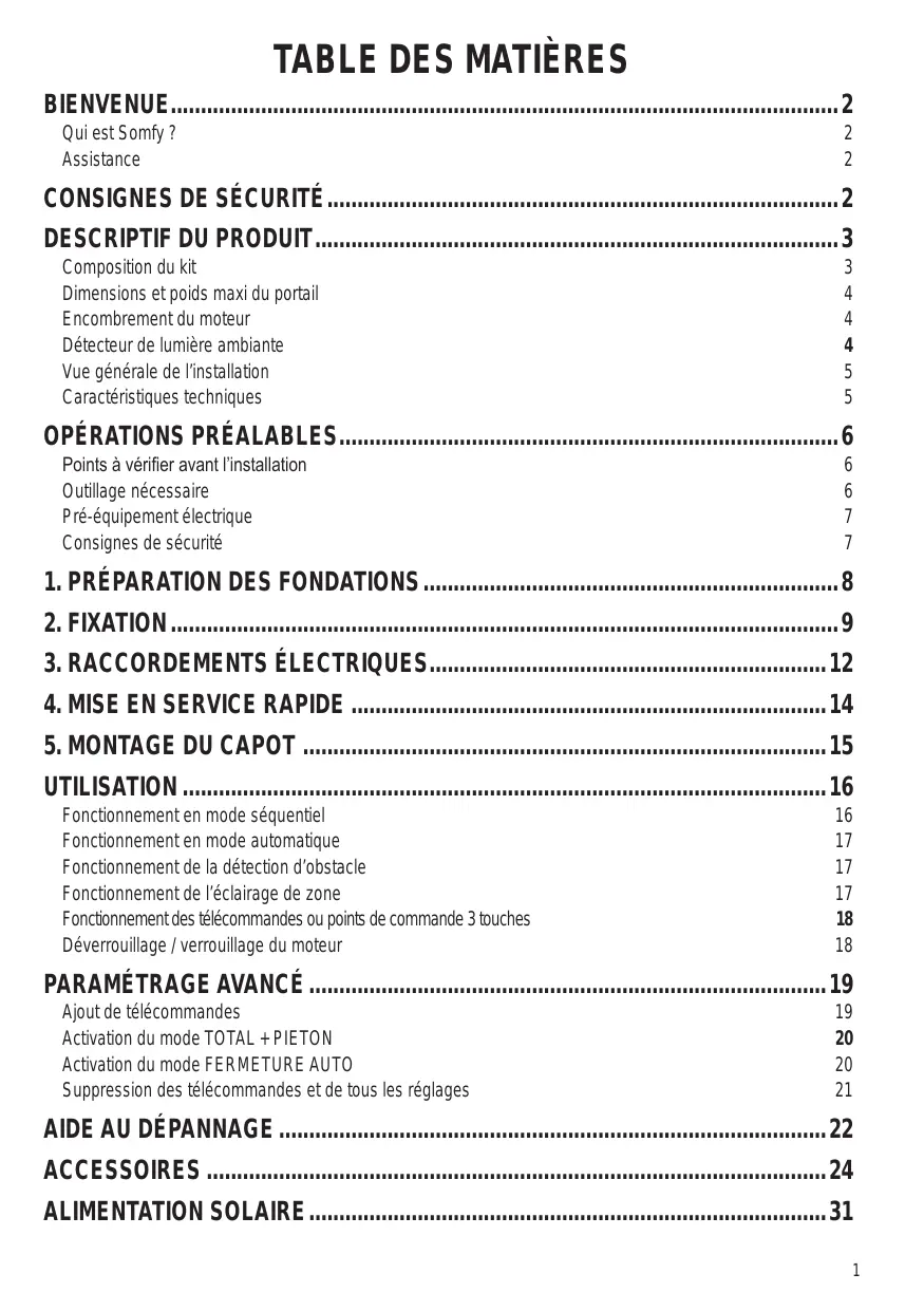 Consignes de sécurité...................................................................................... 2 Descriptif du produit........................................................................................ 3 Composition du kit Dimensions et poids maxi du portail Encombrement du moteur Détecteur de lumière ambiante Vue générale de l’installation Caractéristiques techniques