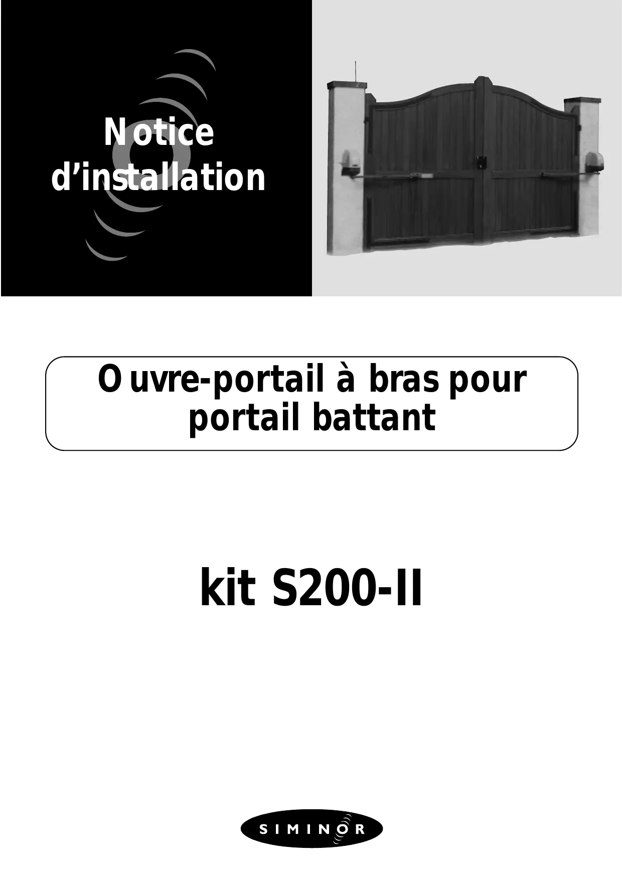 Nous vous remercions d’avoir choisi un équipement SIMINOR. Ce matériel SIMINOR à été commercialisé selon une organisation qualité conforme à la norme ISO 9002 certifiée par l’AFAQ n° 1997/7812. Le soin apporté à chaque étape depuis la conception jusqu’à la livraison assure votre entière satisfaction pour de nombreuses années. Conseils importants Ne jamais intervenir sur l’ouvre-portail sous tension. Éviter les projections directes d’eau. Vérifier régulièrement l’état du portail. Ce produit est destiné à une utilisation domestique. Respecter les normes électriques en vigueur. Nous vous recommandons de lire attentivement l’ensemble de ce livret avant de procéder à l’installation. Porter des lunettes lors des phases de perçage. Déclaration de Conformité Par la présente SIMINOR déclare que ce produit est conforme aux exigences essentielles et aux autres dispositions pertinentes de la directive 1999/5/CE. Les déclarations de conformité sont consultables sur le site www.siminor.fr. Garantie La garantie porte sur une période de 24 mois pendant laquelle, si l’appareil ne fonctionne pas normalement du fait d’une pièce défectueuse, l’ensemble ou la pièce sera, au choix de SIMINOR, soit réparé, soit remplacé. La garantie ne comprend pas la prise en charge des frais de démontage et de réinstallation des produits. En aucun cas la garantie ne peut être prolongée, ni prorogée. Toutes les interventions ou réparations non prévues expressément dans la présente notice ne sont autorisées. Notre société décline toute responsabilité quant au mauvais fonctionnement de l’installation et aux risques d’accident pouvant en découler, si celle-ci n’a pas été réalisée conformément à leur destination, à la description du produit, aux caractéristiques, à nos instructions et aux normes en vigueur. La mise en oeuvre de nos produits s’effectue sur la seule responsabilité du poseur. LA PRÉSENTE GARANTIE NE JOUE PAS : Si les instructions d’installation, d’utilisation ou d’entretien n’ont pas été respectées. En cas de branchement sur une source de courant non appropriée. Si les dommages résultent d’un choc, un incendie, une innondation, un vent violent, un orage ou un évènement de force majeure. Si les dommages résultent d’une usure normale de l’appareil, d’un mauvais entretien ou d’un accident provoqué par une mauvaise utilisation. En cas d’installation à usage non préconisé. En cas de cession de l’appareil à une tierce personne. Ne jamais laisser jouer les enfants à proximité du portail en mouvement. Éviter tout passage de personnes pendant les phases d’ouverture et de fermeture. Les portails en mauvais état doivent être réparés, renforcés voire changés avant l’installation de l’ouvreportail. Suivant le type de fonctionnement, certains accessoires de sécurité et de signalisation (feu orange clignotant, éclairage de zone) peuvent être obligatoires pour que l’installation soit conforme à la norme NFP 25-362. Le portail doit impérativement être muni de butées d’ouverture et de fermeture fixées solidement au sol. Le fait de ne pas mettre les rondelles ø12 x 32 (figure 13) risque de détériorer les brides moteurs.Tous dégât de cet ordre ne sera pas couvert par la garantie. Tout éclairage alimenté en 230V raccordé sur la sortie “éclairage de zone” doit être raccordé à la terre ou être du type double isolation . SIMINOR ne pourra être tenu responsable en cas d’une détérioration due à une mauvaise installation de l’ouvreportail. Ne pas intervenir sur la carte électronique. Ne jamais démonter ou désolidariser les pièces autres que celles composant le kit. En cas de fort vent ou de tempête, bloquer les vantaux (particulièrement sur les vantaux pleins) pour limiter les risques de dommages pouvant être subis par l’ouvreportail. Ne pas oublier de les débloquer avant d’actionner l’automatisme. Définitions Vantail : un portail est composé de deux vantaux. Ouverture totale : ouverture complète des deux vantaux. Ouverture piétonne : ouverture d’un seul vantail. Vantail recouvrant : c’est le vantail qui s’ouvre le premier.