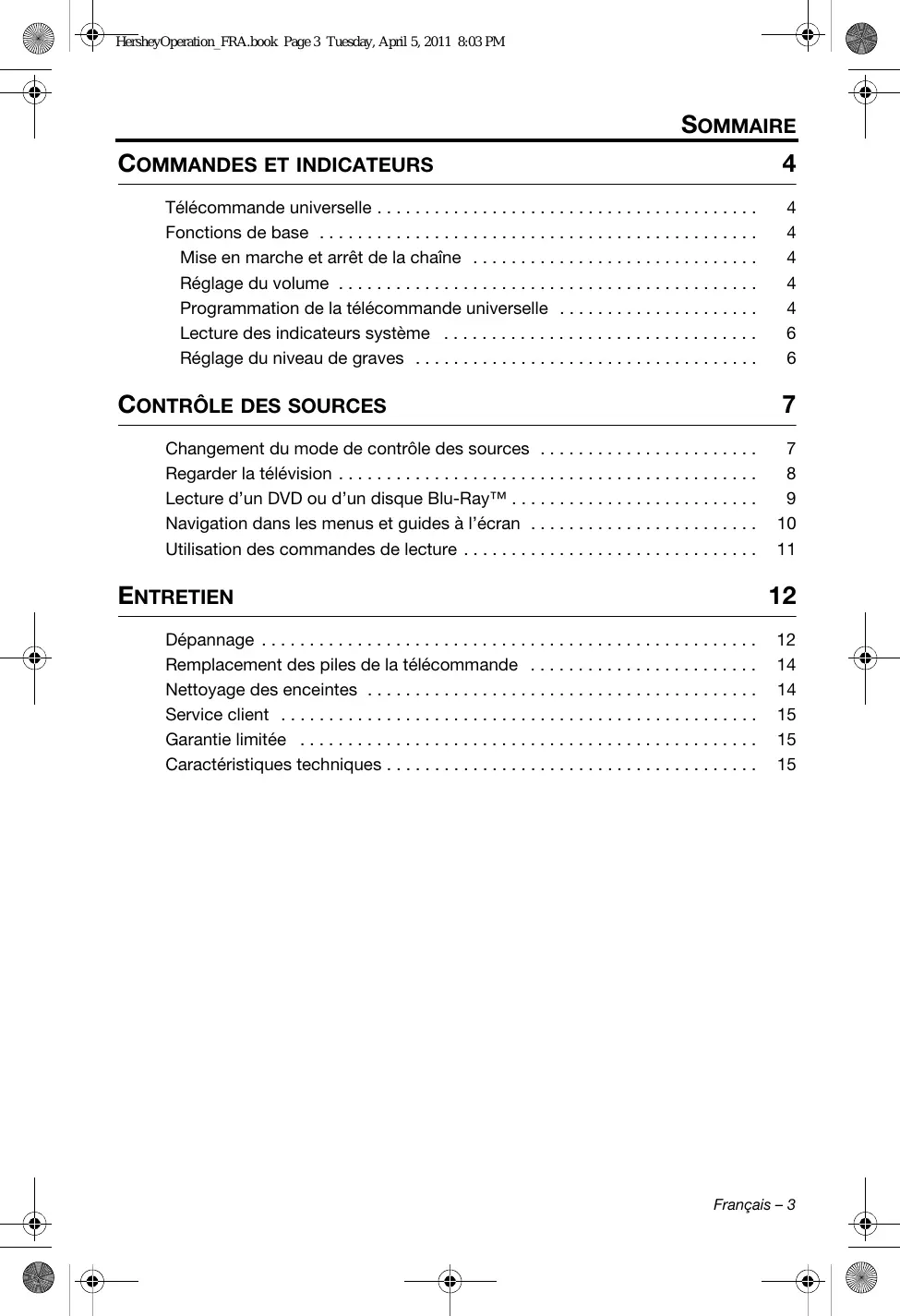 Changement du mode de contrôle des sources . . . . . . . . . . . . . . . . . . . . . . . Regarder la télévision . . . . . . . . . . . . . . . . . . . . . . . . . . . . . . . . . . . . . . . . . . . . Lecture d’un DVD ou d’un disque Blu-Ray™ . . . . . . . . . . . . . . . . . . . . . . . . . . Navigation dans les menus et guides à l’écran . . . . . . . . . . . . . . . . . . . . . . . . Utilisation des commandes de lecture . . . . . . . . . . . . . . . . . . . . . . . . . . . . . . . ENTRETIEN