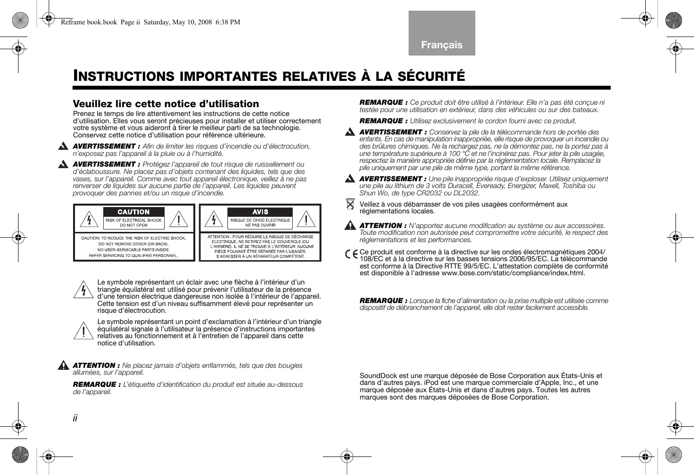 SoundDock est une marque déposée de Bose Corporation aux États-Unis et dans d'autres pays. iPod est une marque commerciale d'Apple, Inc., et une marque déposée aux États-Unis et dans d'autres pays. Toutes les autres marques sont des marques déposées de Bose Corporation.