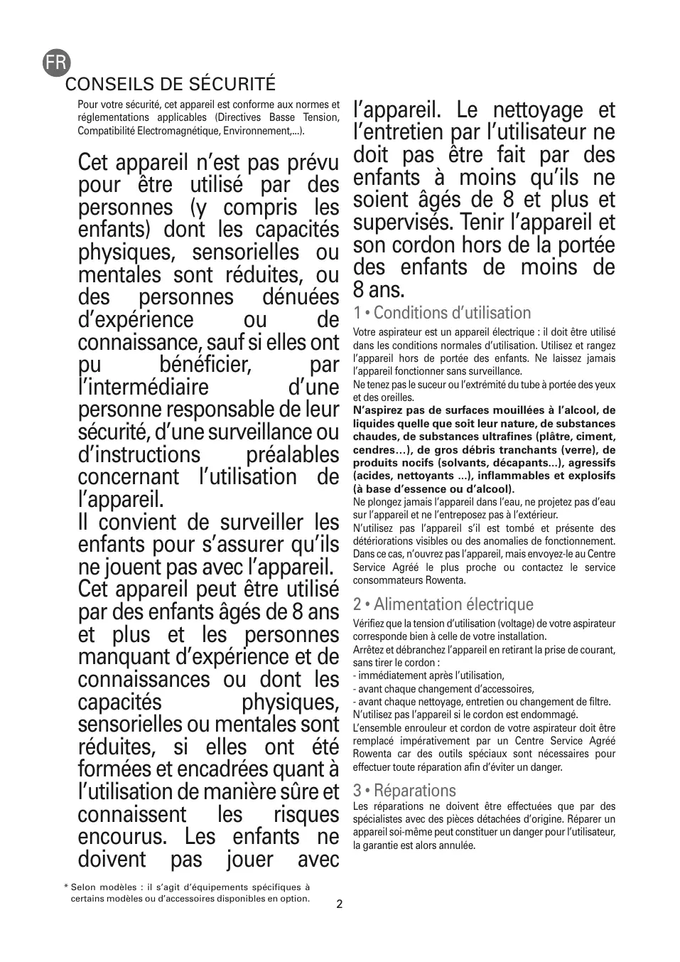 l’appareil. Le nettoyage et l’entretien par l’utilisateur ne doit pas être fait par des enfants à moins qu’ils ne soient âgés de 8 et plus et supervisés. Tenir l’appareil et son cordon hors de la portée des enfants de moins de 8 ans. 1 • Conditions d’utilisation Votre aspirateur est un appareil électrique : il doit être utilisé dans les conditions normales d’utilisation. Utilisez et rangez l’appareil hors de portée des enfants. Ne laissez jamais l’appareil fonctionner sans surveillance. Ne tenez pas le suceur ou l’extrémité du tube à portée des yeux et des oreilles. N’aspirez pas de surfaces mouillées à l’alcool, de liquides quelle que soit leur nature, de substances chaudes, de substances ultrafines (plâtre, ciment, cendres…), de gros débris tranchants (verre), de produits nocifs (solvants, décapants...), agressifs (acides, nettoyants ...), inflammables et explosifs (à base d’essence ou d’alcool). Ne plongez jamais l’appareil dans l’eau, ne projetez pas d’eau sur l’appareil et ne l’entreposez pas à l’extérieur. N’utilisez pas l’appareil s’il est tombé et présente des détériorations visibles ou des anomalies de fonctionnement. Dans ce cas, n’ouvrez pas l’appareil, mais envoyez-le au Centre Service Agréé le plus proche ou contactez le service consommateurs Rowenta. 2 • Alimentation électrique Vérifiez que la tension d’utilisation (voltage) de votre aspirateur corresponde bien à celle de votre installation. Arrêtez et débranchez l’appareil en retirant la prise de courant, sans tirer le cordon : - immédiatement après l’utilisation, - avant chaque changement d’accessoires, - avant chaque nettoyage, entretien ou changement de filtre. N’utilisez pas l’appareil si le cordon est endommagé. L’ensemble enrouleur et cordon de votre aspirateur doit être remplacé impérativement par un Centre Service Agréé Rowenta car des outils spéciaux sont nécessaires pour effectuer toute réparation afin d’éviter un danger. 3 • Réparations Les réparations ne doivent être effectuées que par des spécialistes avec des pièces détachées d’origine. Réparer un appareil soi-même peut constituer un danger pour l’utilisateur, la garantie est alors annulée.