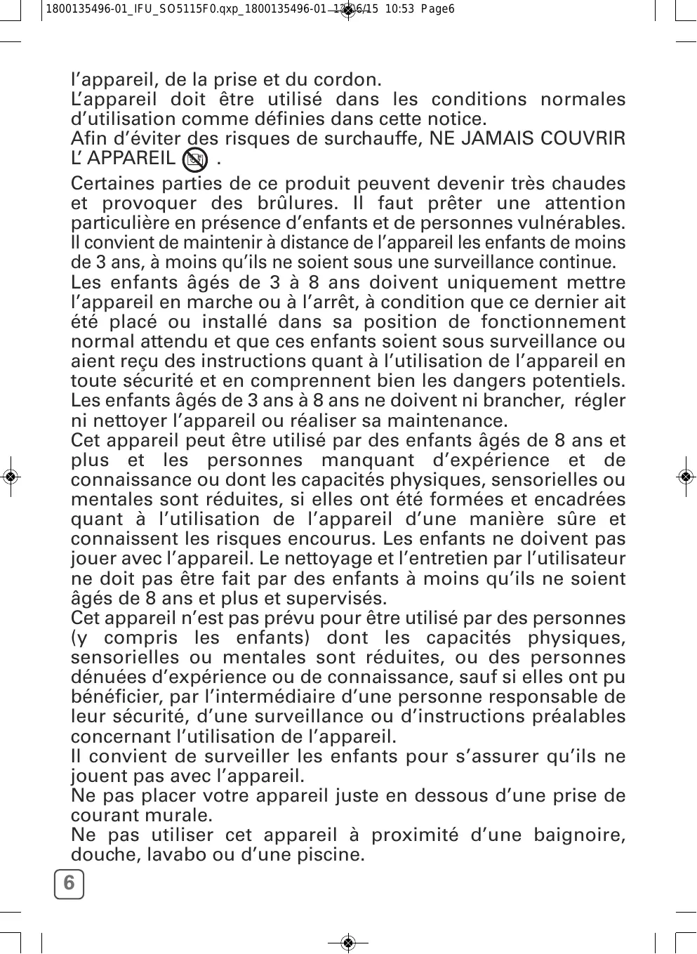 L’appareil doit être utilisé dans les conditions normales d’utilisation comme définies dans cette notice. Afin d’éviter des risques de surchauffe, NE JAMAIS COUVRIR L’ APPAREIL . Certaines parties de ce produit peuvent devenir très chaudes et provoquer des brûlures. Il faut prêter une attention particulière en présence d’enfants et de personnes vulnérables. Il convient de maintenir à distance de l’appareil les enfants de moins de 3 ans, à moins qu’ils ne soient sous une surveillance continue. Les enfants âgés de 3 à 8 ans doivent uniquement mettre l’appareil en marche ou à l’arrêt, à condition que ce dernier ait été placé ou installé dans sa position de fonctionnement normal attendu et que ces enfants soient sous surveillance ou aient reçu des instructions quant à l’utilisation de l’appareil en toute sécurité et en comprennent bien les dangers potentiels. Les enfants âgés de 3 ans à 8 ans ne doivent ni brancher, régler ni nettoyer l’appareil ou réaliser sa maintenance. Cet appareil peut être utilisé par des enfants âgés de 8 ans et plus et les personnes manquant d’expérience et de connaissance ou dont les capacités physiques, sensorielles ou mentales sont réduites, si elles ont été formées et encadrées quant à l’utilisation de l’appareil d’une manière sûre et connaissent les risques encourus. Les enfants ne doivent pas jouer avec l’appareil. Le nettoyage et l’entretien par l’utilisateur ne doit pas être fait par des enfants à moins qu’ils ne soient âgés de 8 ans et plus et supervisés. Cet appareil n’est pas prévu pour être utilisé par des personnes (y compris les enfants) dont les capacités physiques, sensorielles ou mentales sont réduites, ou des personnes dénuées d’expérience ou de connaissance, sauf si elles ont pu bénéficier, par l’intermédiaire d’une personne responsable de leur sécurité, d’une surveillance ou d’instructions préalables concernant l’utilisation de l’appareil. Il convient de surveiller les enfants pour s’assurer qu’ils ne jouent pas avec l’appareil. Ne pas placer votre appareil juste en dessous d’une prise de courant murale. Ne pas utiliser cet appareil à proximité d’une baignoire, douche, lavabo ou d’une piscine.