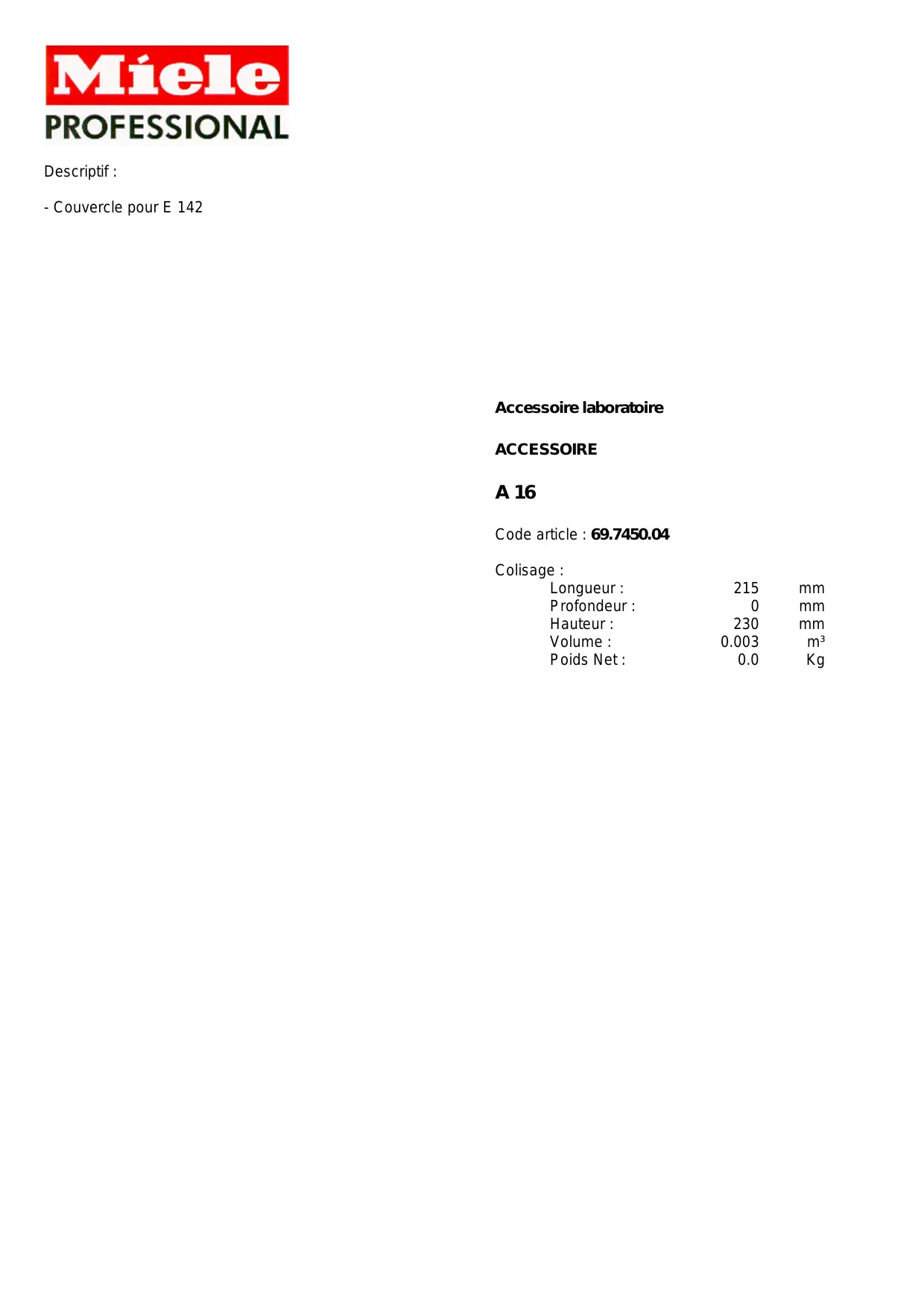 Descriptif : - Couvercle pour E 142 Accessoire laboratoire ACCESSOIRE A 16 Code article : 69.7450.04 Colisage : Longueur : Profondeur : Hauteur : Volume : Poids Net :