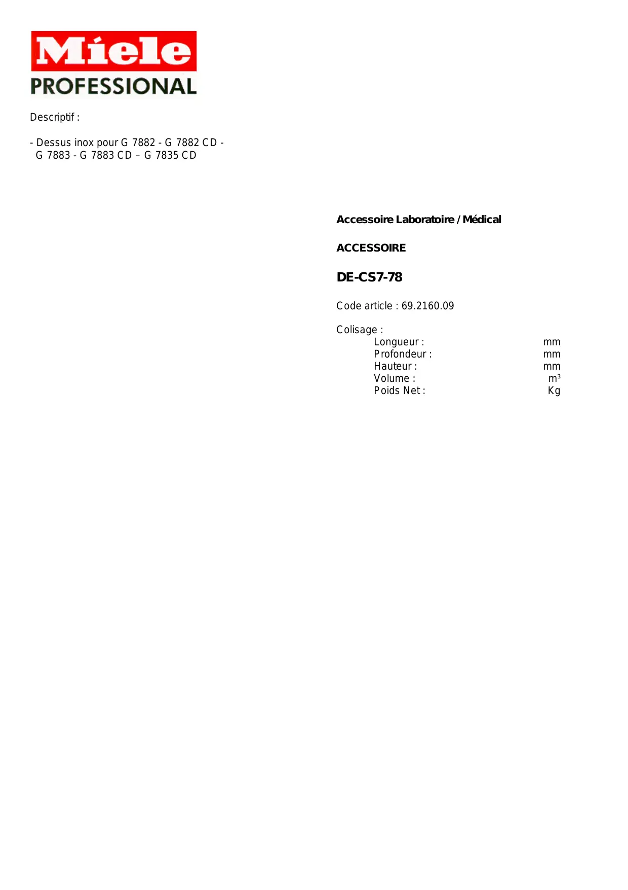 DE-CS7-78 DESCRIPTIF - Accessoire pour appareil professionnel MIELE - Notice d'utilisation et mode d'emploi gratuit