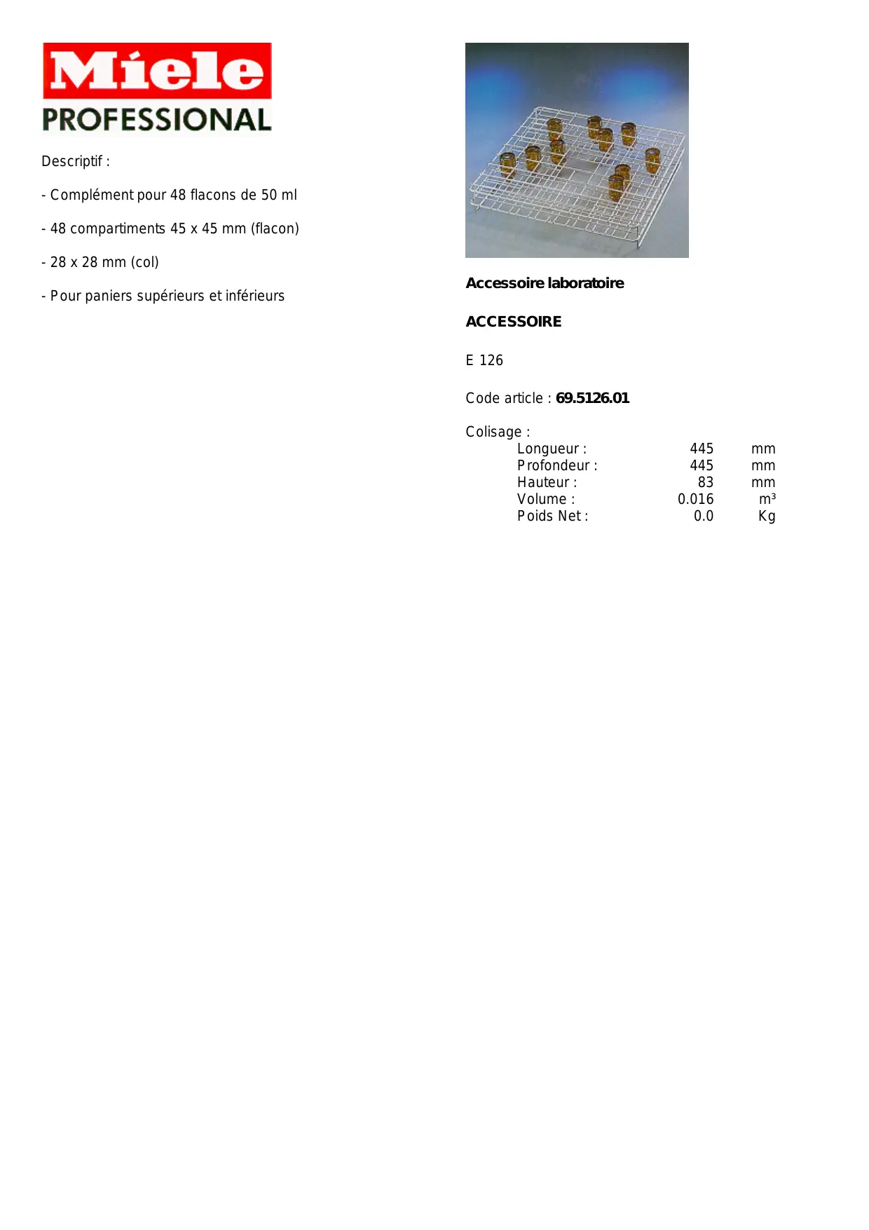 Descriptif : - Complément pour 48 flacons de 50 ml - 48 compartiments 45 x 45 mm (flacon) - 28 x 28 mm (col) - Pour paniers supérieurs et inférieurs Accessoire laboratoire ACCESSOIRE E 126 Code article : 69.5126.01 Colisage : Longueur : Profondeur : Hauteur : Volume : Poids Net :