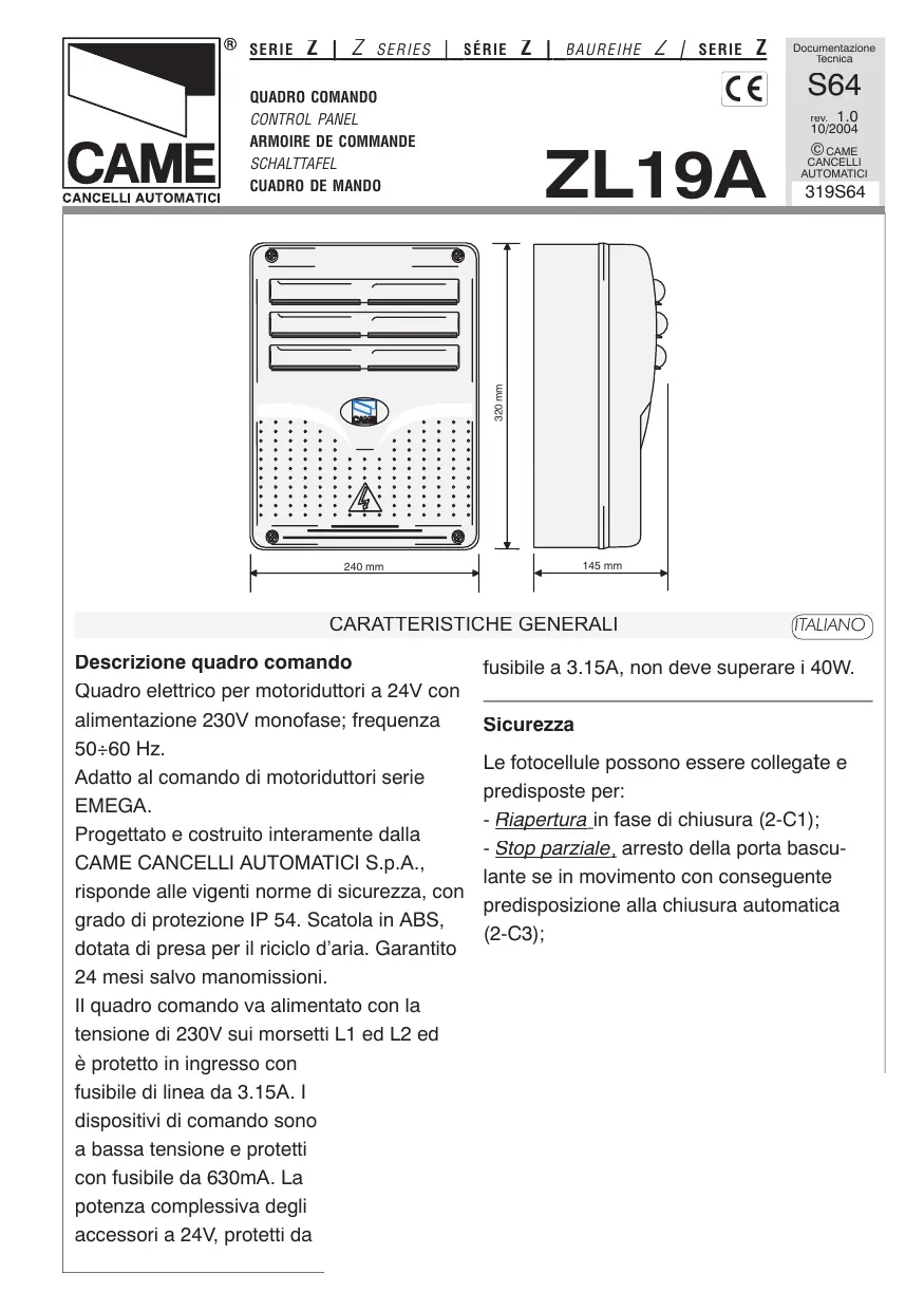 Adaptée à commander les motoréducteurs de la série EMEGA. L’armoire est entièrement conçue et fabriquée par CAME CANCELLI AUTOMATICI S.p.A. conformément aux normes de sécurité en vigueur avec un degré de protection IP 54. Boîtier en ABS muni de prise de circulation d’air. Garantie 24 mois sauf en cas d’endommagement. L’armoire de commande doit être alimentée avec une tension de 230V sur les bornes L1 et L2 et elle est protégée en entrée par un fusible de ligne de 3.15A. Les dispositifs de commande sont à basse tension et protégés avec un fusible de 630mA. La puissance totale des accessoires en 24V, protégés par un fusible de 3.15A, ne doit pas dépasser 40W.