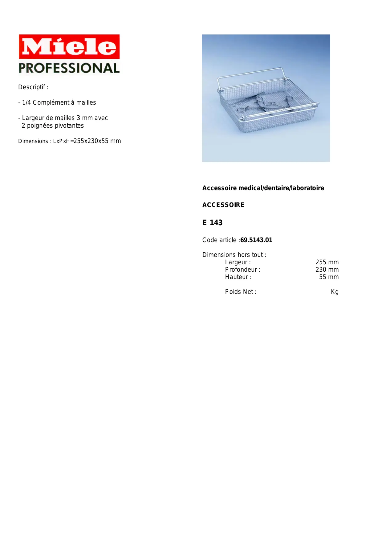 E 143 DESCRIPTIF - Accessoire de stérilisation MIELE - Notice d'utilisation et mode d'emploi gratuit